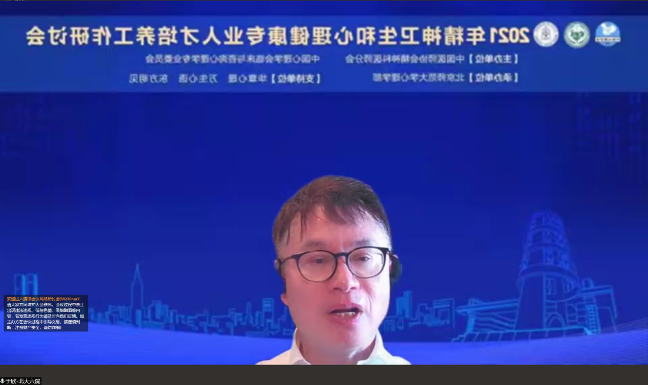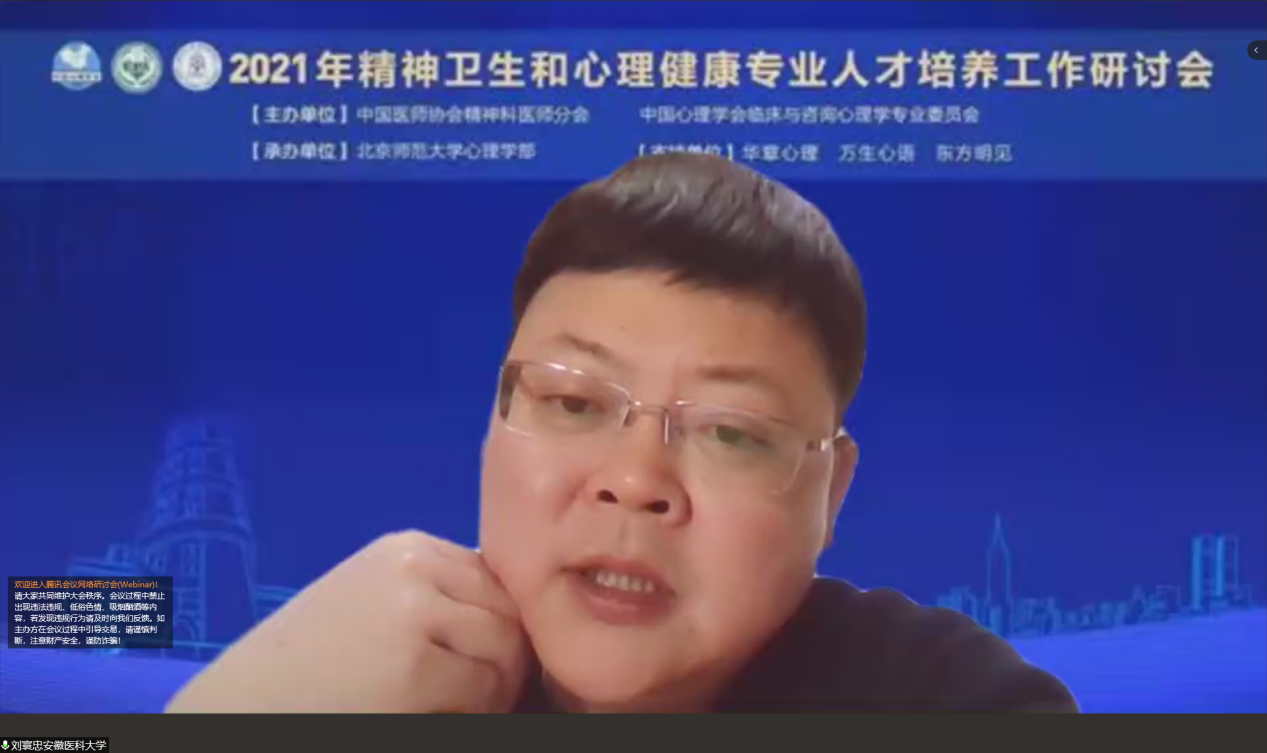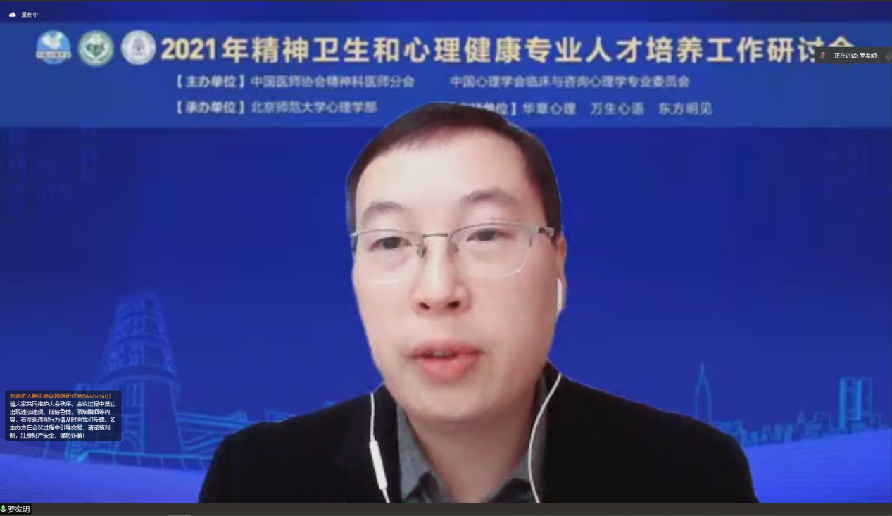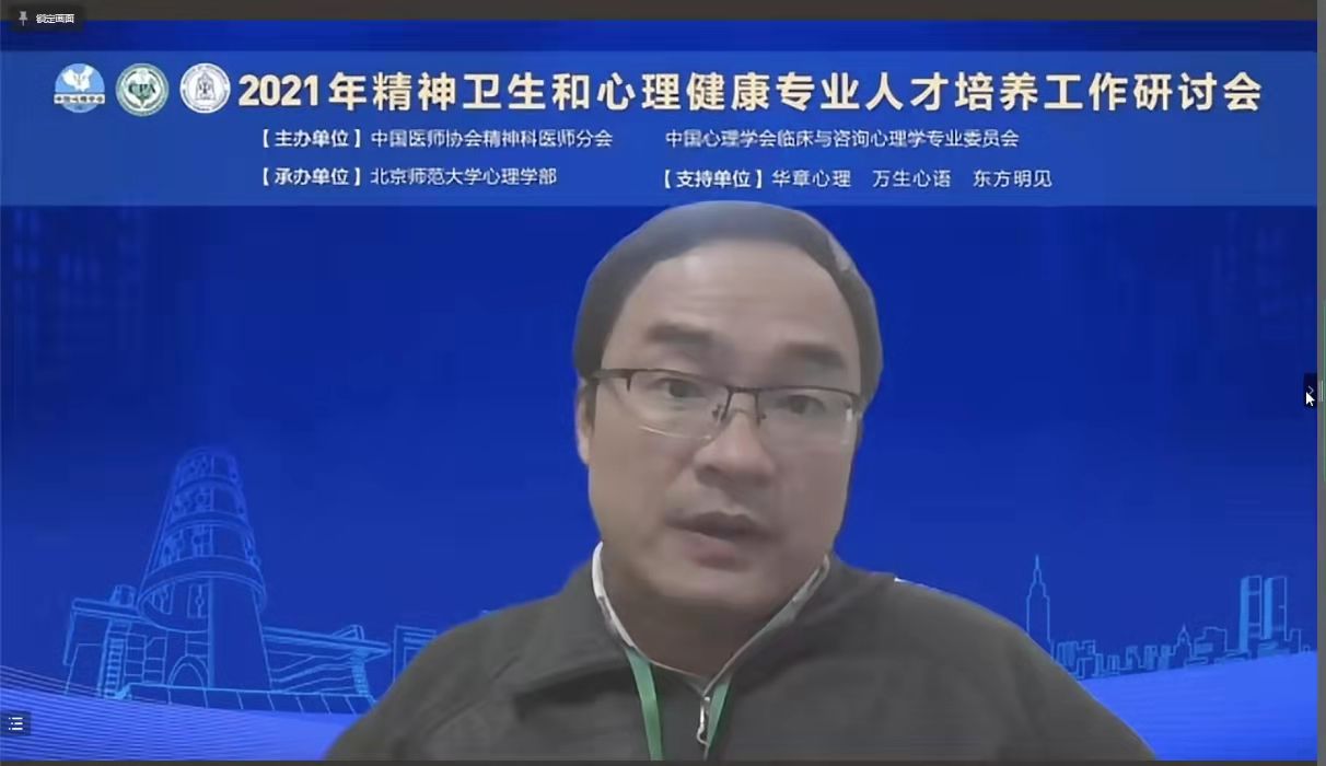 2021年12月3日,“2021年精神卫生和心理健康专业人才培养工作研讨会”在线上平台顺利召开。会议由中国医师协会精神科医师分会、中国心理学会临床与咨询心理学专业委员会主办,98色花堂 承办。本次会议主题为精神卫生和心理健康领域的专业人才高质量、规模化学历教育,为提升国民精神与心理健康素养保驾护航。来自精神医学专业人才培养协作网络、临床与咨询心理学学历教育联盟的专家、学者参与本次大会,会议全天累计有超过6000人次参与。 本次大会的开幕式由98色花堂 教授、新任中国心理学会临床与咨询心理学专业委员会主任(第七届)伍新春主持开场。
