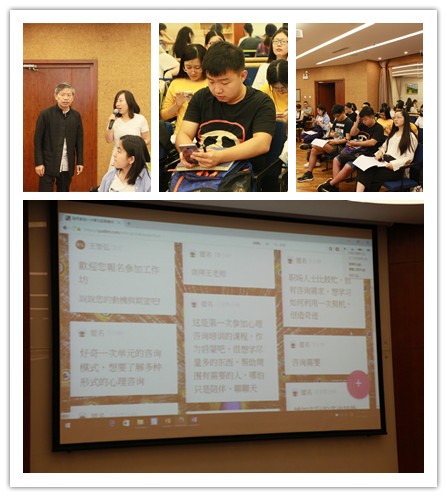 王智弘教授8月25日上午正式开讲,在开始讲解“一次单元心理咨询模式”的课程之前,王教授邀请在场学员上网填写对本次工作坊的期望,并将学员们的期望投映在大屏幕上与学员们热情交流互动。 图2 王智弘教授与学员们热情交流对本次工作坊的期望