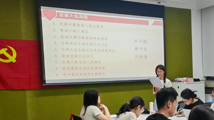 首先,牛子瑜同志宣读了自己的入党志愿书,并向党组织汇报了他成为积极分子以来的思想、学习、工作等情况。两位入党介绍人汇报了牛子瑜同志的有关情况以及对其入党的意见。支部书记宣读了对牛子瑜同志的政治审查报告。随后,在支部书记的组织下,与会党员针对牛子瑜同志的平时表现进行了热烈的讨论和评议,讨论中指出了该同志的优、缺点,认为牛子瑜同志入党动机端正,自提出入党申请以来,一直积极向党组织靠拢,在支部的各项活动中能够积极发言,表达自己的观点,认真学习理论知识,时刻以党员先锋模范的标准要求自己。讨论过后,与会正式党员对牛子瑜同志能否按期发展采用无记名投票的方式进行表决。经过计票,支部书记宣布大会决议,支部大会通过接收牛子瑜同志为中共预备党员。牛子瑜同志发表入党感言,表示将更加严格要求自己,努力克服自己的缺点和不足,争取早日成为一名优秀的共产党员。