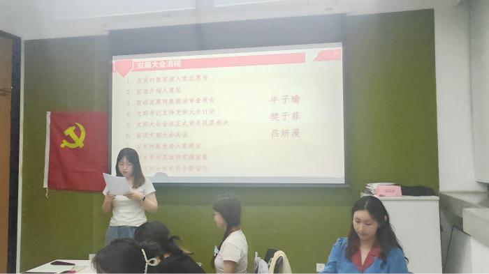 接着,吕妍漫同志宣读了自己的入党志愿书,并向党组织汇报了她成为积极分子以来的思想、学习、工作等情况。两位入党介绍人汇报了吕妍漫同志的有关情况以及对其入党的意见。支部书记宣读了对吕妍漫同志的政治审查综合报告。随后,在支部书记的组织下,与会党员针对吕妍漫同志的平时表现进行了热烈的讨论和评议,讨论中指出了该同志的优、缺点,认为吕妍漫同志入党动机端正,自提出入党申请以来,一直积极向党组织靠拢,认真学习理论知识,坚持向党组织汇报思想学习情况,热心助人,并时刻以党员先锋模范的标准要求自己。讨论过后,与会正式党员对吕妍漫同志能否按期发展采用无记名投票的方式进行表决。经过计票,支部书记宣布大会决议,支部大会通过接收吕妍漫同志为中共预备党员。吕妍漫同志发表入党感言,表示会继续在思想和实践上不断提高,努力成为一个优秀的共产党员。