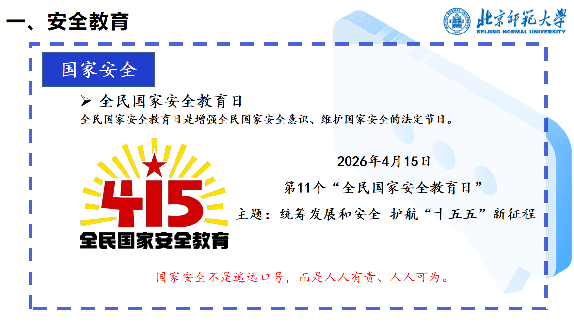 结合“4·15全民国家安全教育日”,班会重点普及国家安全知识,号召全体同学积极参与全国高校国家安全教育课、知识答题等线上活动,强化国家安全人人有责的意识。