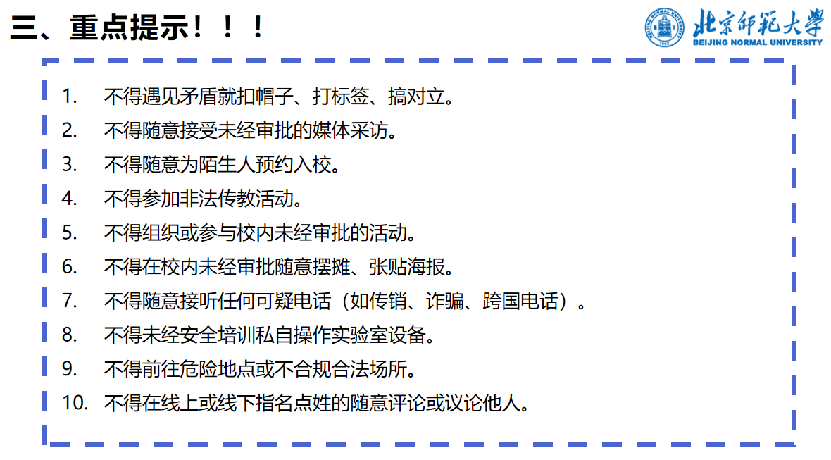 最后,班会重申校园十条行为规范,要求全体同学严守纪律底线,规范日常言行,不参与违规活动、不接受未经审批采访、不随意引陌生人入校,共同维护安全、文明、有序的校园环境。