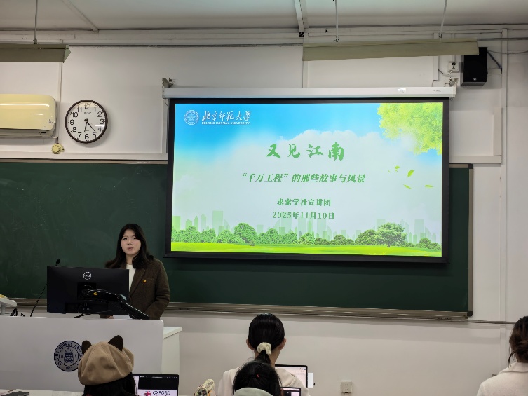 随后,求索学社宣讲团的郝语赫学姐为同学们带来了名为《又见江南:“千万工程”的那些故事与风景》的主题宣讲。宣讲通过介绍浙江省萧山区梅林村和安吉县余村的乡村振兴实例,让同学们深入认识了“千村示范、万村整治”工程经验对于有效推进乡村振兴的引领作用,也充分了解了“绿水青山就是金山银山”的深切内涵。建设美丽中国是实现中华民族伟大复兴的重要内容,“千万工程”告诉大家,要坚持新发展理念,实现人与自然和谐共生。