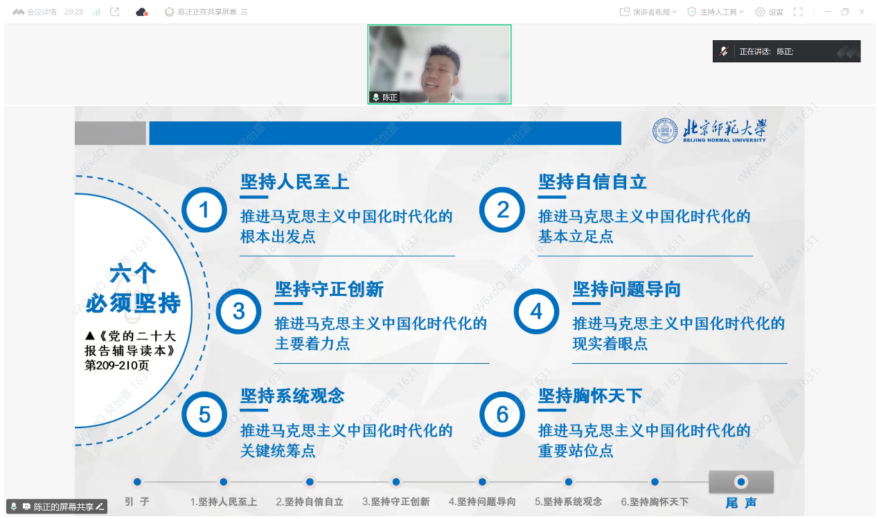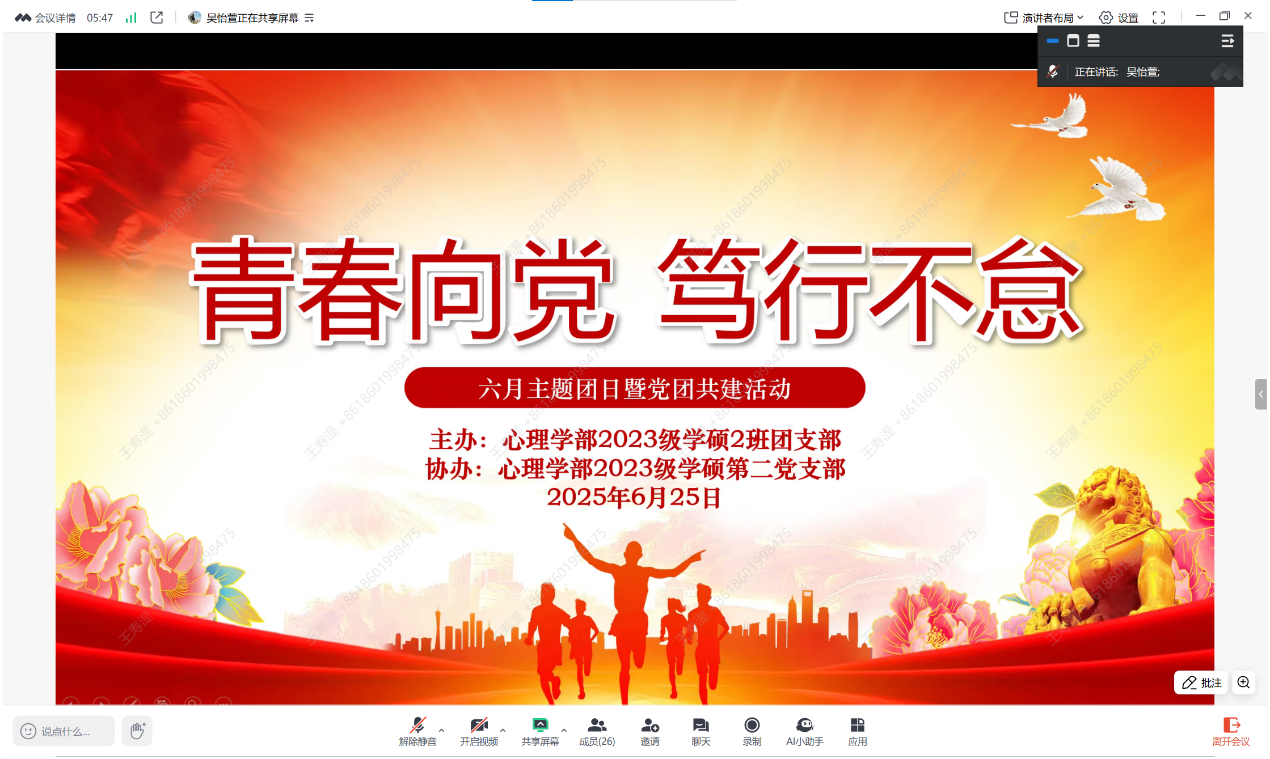 2025年6月25日晚20:00点,98色花堂 2023级学术硕士第二团支部六月主题团日暨党团共建活动以线上腾讯会议的形式顺利开展。本次党团共建活动由团支书吴怡萱同志主持,共31名党员、共青团员同志参与。活动邀请了求索学社宣讲团的陈正同志进行分享,主题为《彩云长在有新天——从“六个必须坚持”看马克思主义中国化时代化新境界》。本次宣讲解读了党的二十大报告中提出的“六个必须坚持”核心内容,并重点通过习近平总书记的基层工作案例阐释了“人民至上”的理论内涵。