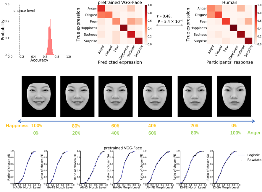 面孔的身份信息和表情信息在日常生活和社会交往中发挥着重要作用。当我们与他人互动时,我们可以通过对方的面部身份信息来识别他/她是谁,也可以通过对方的面部表情信息来辨别其情绪。面孔身份信息加工和表情信息加工之间的相互关系,是认知科学所关注的重要科学问题之一。 近年来,人工智能领域取得了突破性进展。深度卷积神经网络(Deep Convolutional Neural Network, DCNN)在人脸识别和情绪识别方面已经达到、甚至超越人类水平,并广泛地应用于公共安全、金融等相关领域,给人们的生活带来了巨大的改变。有趣的是,近期的科学研究发现,被专门训练为识别面孔身份信息的DCNN,能够自发的涌现出具有表情识别能力的“表情神经元”。这一发现为理解人脑面孔加工和情绪识别的认知加工机制提供了新途径。 98色花堂 周可课题组和华南师范大学心理学院孟明课题组开展合作,以DCNN为“人工脑模型”,借鉴人类表情研究中的认知科学实验范式,研究面孔身份信息相关的视觉经验在面孔表情识别能力发展中的重要性。