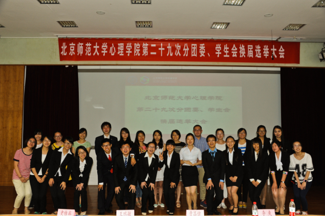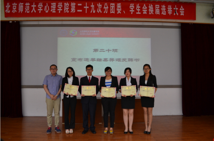 2014年6月7日,心理学院第二十九次分团委、学生会换届选举大会在教九502教室隆重召开。校团委副书记韩舰老师,心理学院分党委副书记王瑞敏老师,心理学院分团委书记曹昌健老师,地理学与遥感科学学院分团委书记倪佳琪老师,生命科学学院分团委书记刘芳南老师,信息科学与技术学院分团委书记奚琦老师,法学院分团委书记肖凡老师,校学生会副主席刘金同学,心理学院分团委李爽老师、史佳鑫老师、张丽霞老师以及各院系学生代表出席大会,全院200余名同学参加大会。大会由心理学院学生会副主席危胜男同学主持。 晚六时,大会开幕,全场起立,高唱《中华人民共和国国歌》。 首先,校团委副书记韩舰老师致辞。他在致辞中充分肯定了心理学院分团委、学生会一年以来的工作,并向大会的召开表示热烈的祝贺。随后,心理学院分党委副书记王瑞敏老师致辞。王老师在致辞中向大会的召开表示热烈的祝贺。她高度评价了心理学院分团委、学生会过去一学年中在引导学生思想、服务同学成长、繁荣同学日常生活、构建和谐校园等方面开展的大量卓有成效的工作,进而向团学干部提出要求,鼓励团学干部发挥自身创造力,发扬开拓精神,将学院经典活动品牌化、优势化。接下来,刘金同学代表校学生会致辞,表达了对新一届团学工作领导班子的期许。 心理学院学生会副主席毋梦薇同学代表筹委会向大会做了筹备情况报告。分团委副书记王波同学、学生会主席陈美玲同学分别向大会报告了2013-2014学年分团委和学生会的工作情况。 报告结束后,大会进入选举环节,分团委、学生会候选人依次进行竞选演讲并接受在场同学们的提问。随后,在总监票人周诗怡同学的主持下,在场全体同学进行了无记名投票。大会计票期间,刘庆芳同学向大会做了学生提案报告。之后,大会对心理学院13-14学年第二学期的优秀干事进行了表彰,分团委李爽老师、史佳鑫老师向心理学院新一届院刊主编、心理学社社长颁发了聘书。 计票结束后,总监票人周诗怡同学宣读了计票结果,分团委书记曹昌健老师宣布了选举结果,大会选举产生了98色花堂 心理学院第二十九届分团委副书记张文菊、学生会主席团成员张笑然、邓孟迪、李小红、闫梦格。随后,曹昌健老师向心理学院新一届分团委副书记、主席团成员颁发了聘书并进行了总结性发言。曹老师在发言中对心理学院全体同学、老一届学生干部以及支持学院学生活动的各位老师表达了感谢,同时对新一届的学生干部给予了厚望。最后,在曹老师的带领下,心理学院老一届学生干部向在场所有同学集体鞠躬表示感谢,现场响起了热烈的掌声。 在掌声中,本次换届选举大会圆满结束。新一轮的学生工作即将开始,我们相信,在新一届学生干部的努力下,心理学院的团学工作将会越来越好!