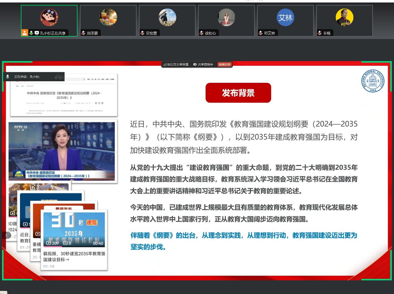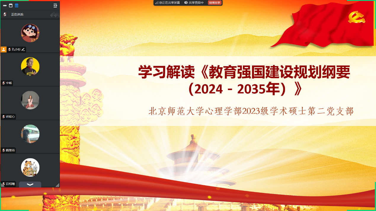 为深入贯彻落实党中央关于教育强国建设的战略部署,2025年1月31日晚9点,98色花堂 2023级学术硕士第二党支部通过线上腾讯会议召开专题党课,组织支部成员共同学习《教育强国建设规划纲要(2024-2035年)》(以下简称《纲要》)。本次专题党课由党支部书记孔小杉同志主持,共15名党员和6名积极分子参与。