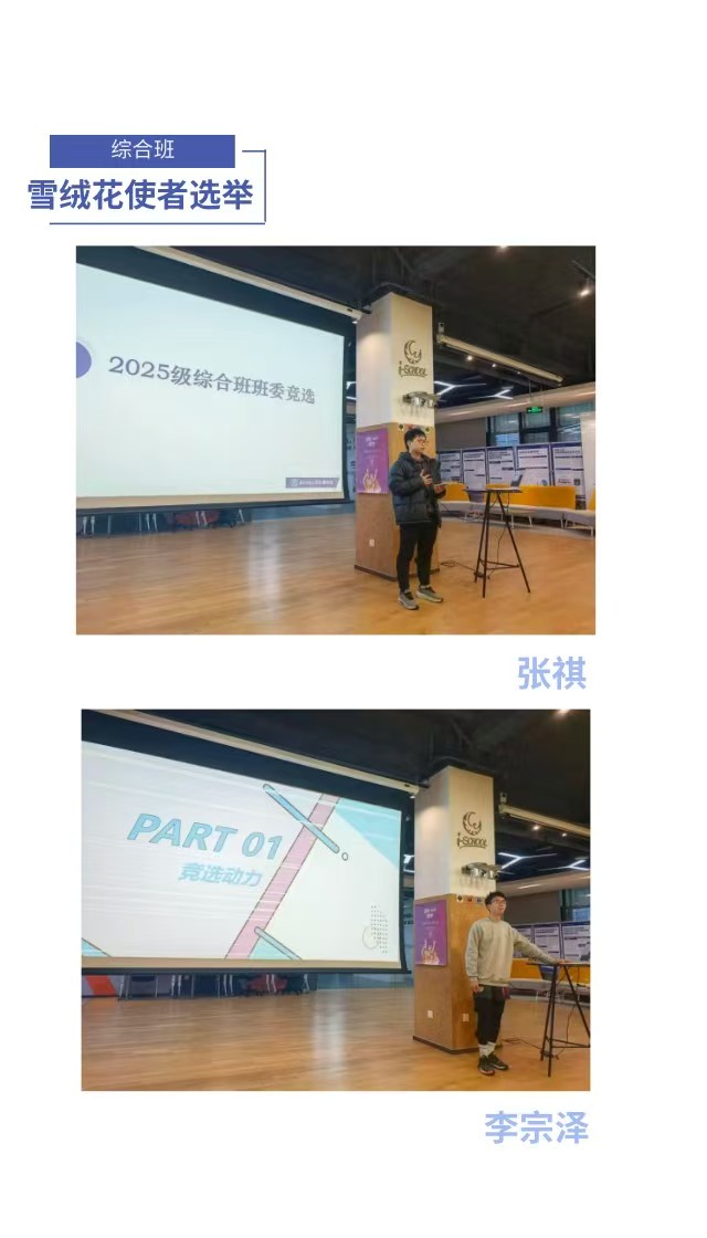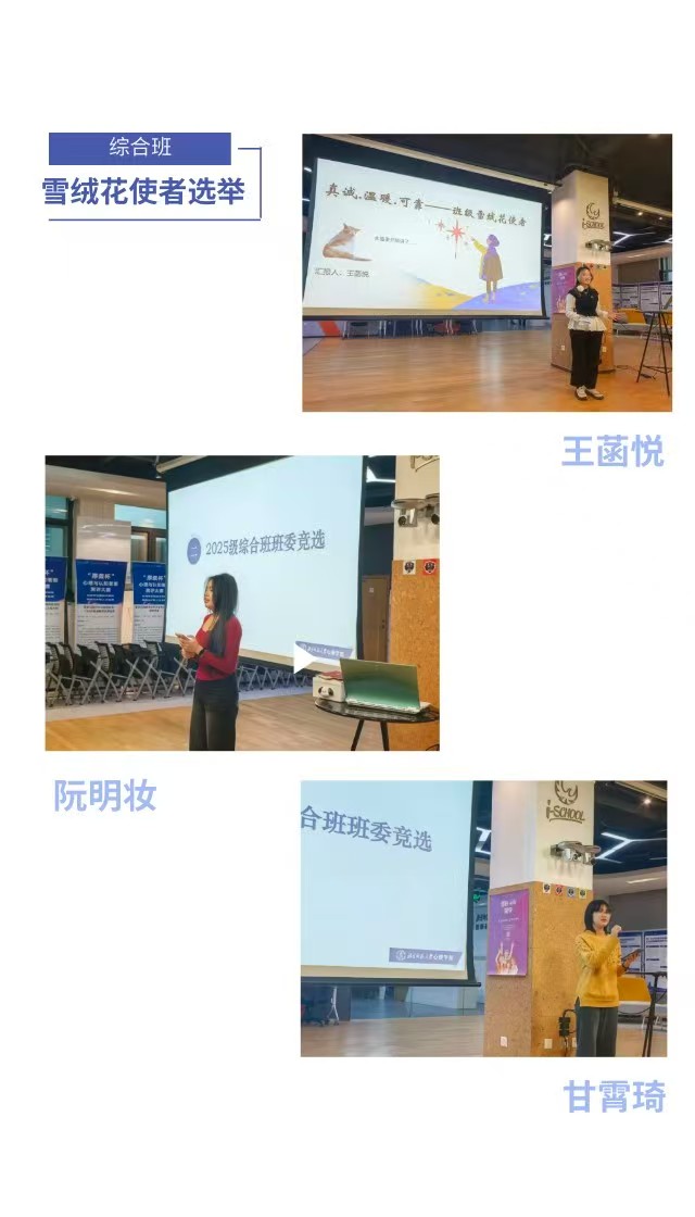 最后,在公平、公正、公开的原则指导下,经同学们现场投票、确认,最终产生的班委名单如下: 【励耘班】 班长:陈朗文 生活委员:缪蕴美 文艺委员:周琳怡 雪绒花使者(女):李芊瑶 雪绒花使者(男):苗智杰 宣传委员:席艺展 学习委员:陆哲 【综合班】 班长:方雲舒 生活委员:柴一诺 文艺委员:王晶盈 雪绒花使者(女):王菡悦 雪绒花使者(男):李宗泽 宣传委员:靳可心 学习委员:张容溥 本次班级选举大会圆满结束。 供稿人:席艺展、靳可心 供图人:齐惠紫、陈朗文 审核人:齐惠紫 |