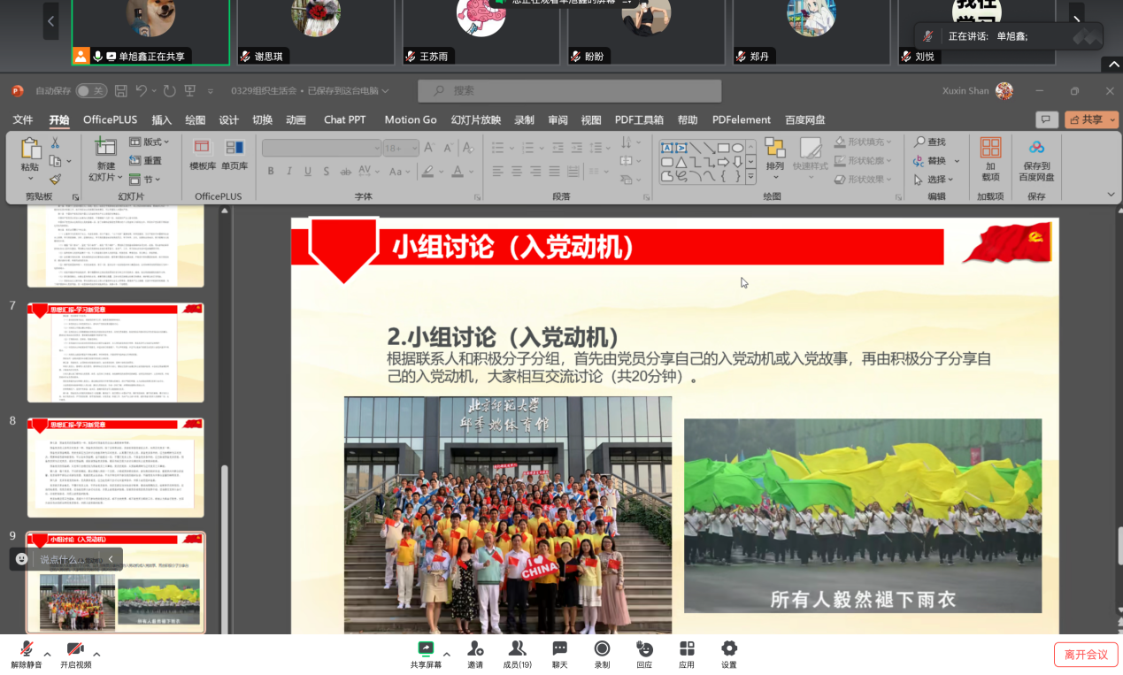 随后,各位党员带领积极分子分小组讨论,由各位积极分子分享自己的入党动机,大家都根据自己的真实经历,真诚地分享了许多动人的故事,有同学的姥爷知青下乡建设戈壁滩,牺牲在工作岗位,有同学外婆的爸爸被国民党强行抓去当苦力导致外婆悲苦童年,有同学的家乡就是革命老区,从小在爱国教育中长大……这些沉甸甸的故事构筑了每个人虽然各不相同又同样坚定的入党动机,也让我们深刻感受到了共产党的伟大,无条件帮助和支持我们,在我们每个人身边或多或少都留下过令人感动又钦佩的故事,也正是这份力量激发出我们靠近党、成为党、忠诚党的不竭动力和实际行动。相信各位积极分子经过这次会议的分享,会更加明确和坚定自己的入党动机,并在之后的实际生活中不断笃信并践行。