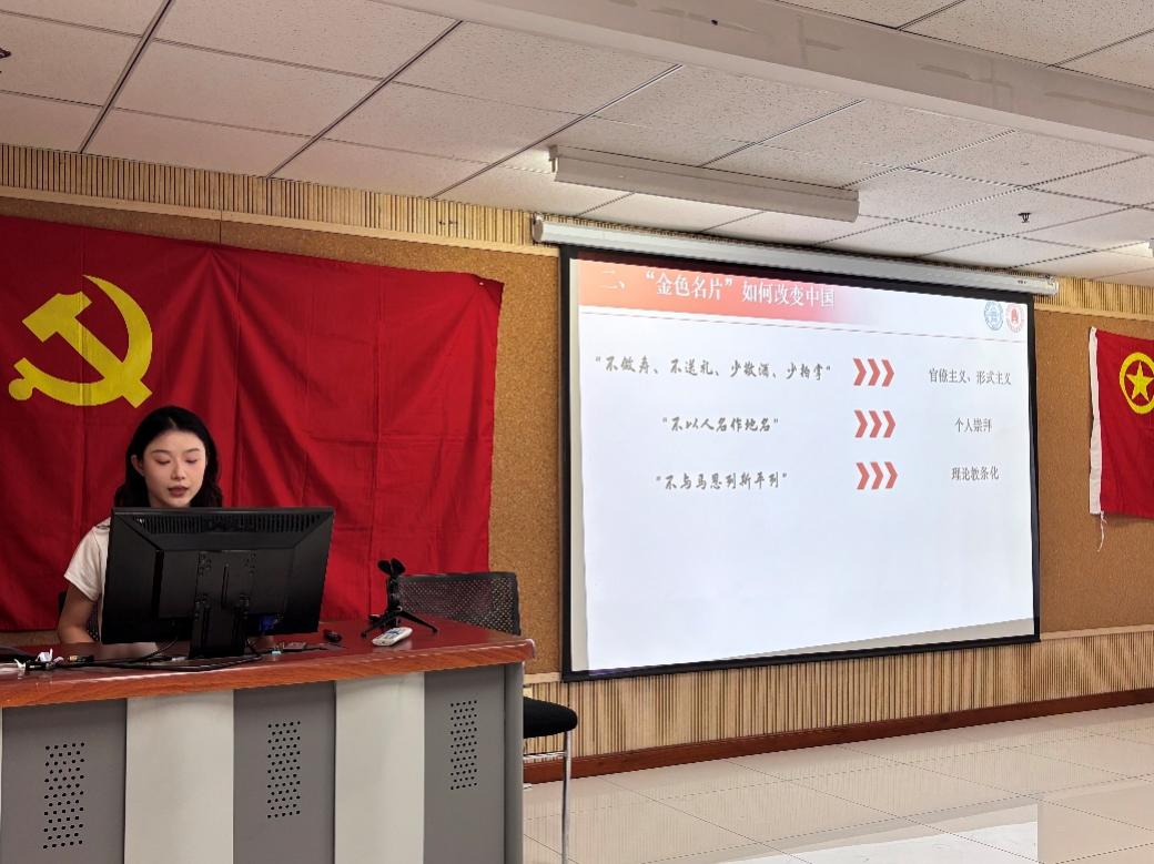 在《深入贯彻中央八项规定精神学习教育》宣讲中,刘惠兰同学首先介绍了中央八项规定的内容,并从七届二中全会的“六条规定”到如今的中央八项规定,带领同学们回顾了党的作风建设历程。随后,刘惠兰同学以现实案例,展示了深入贯彻中央八项规定精神的工作成效。宣讲的最后一部分结合同学们的学习生活实际,从中央八项规定精神的角度,分析了随意取用学生活动剩余物资、学生工作中形式主义的会议和推送、校园生活中的水电浪费这三种应杜绝的现象,使同学们领悟到中央八项规定精神与中华传统美德一脉相承,每个人都应践行。