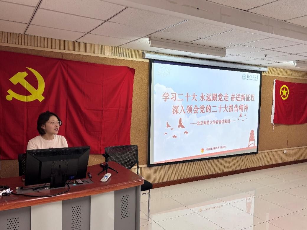 在《学习二十大,永远跟党走,奋进新征程——深入学习领会党的二十大报告精神》宣讲中,金鹏羽同学首先以职业发展等贴近同学们生活的话题为引子,强调了学习二十大报告的重要性、必要性,随后带领同学们回顾了二十大报告的主题和起草过程。之后,金鹏羽同学通过对十九大报告、二十大报告结构的详细对比,以结构变化为切入点向同学们介绍了党的理论进程,并聚焦“实施科教兴国战略,强化现代化建设人才支撑”这一与同学们紧密关联的主题,讨论了科教兴国战略背景下青年学生何为、北师大人何为。
