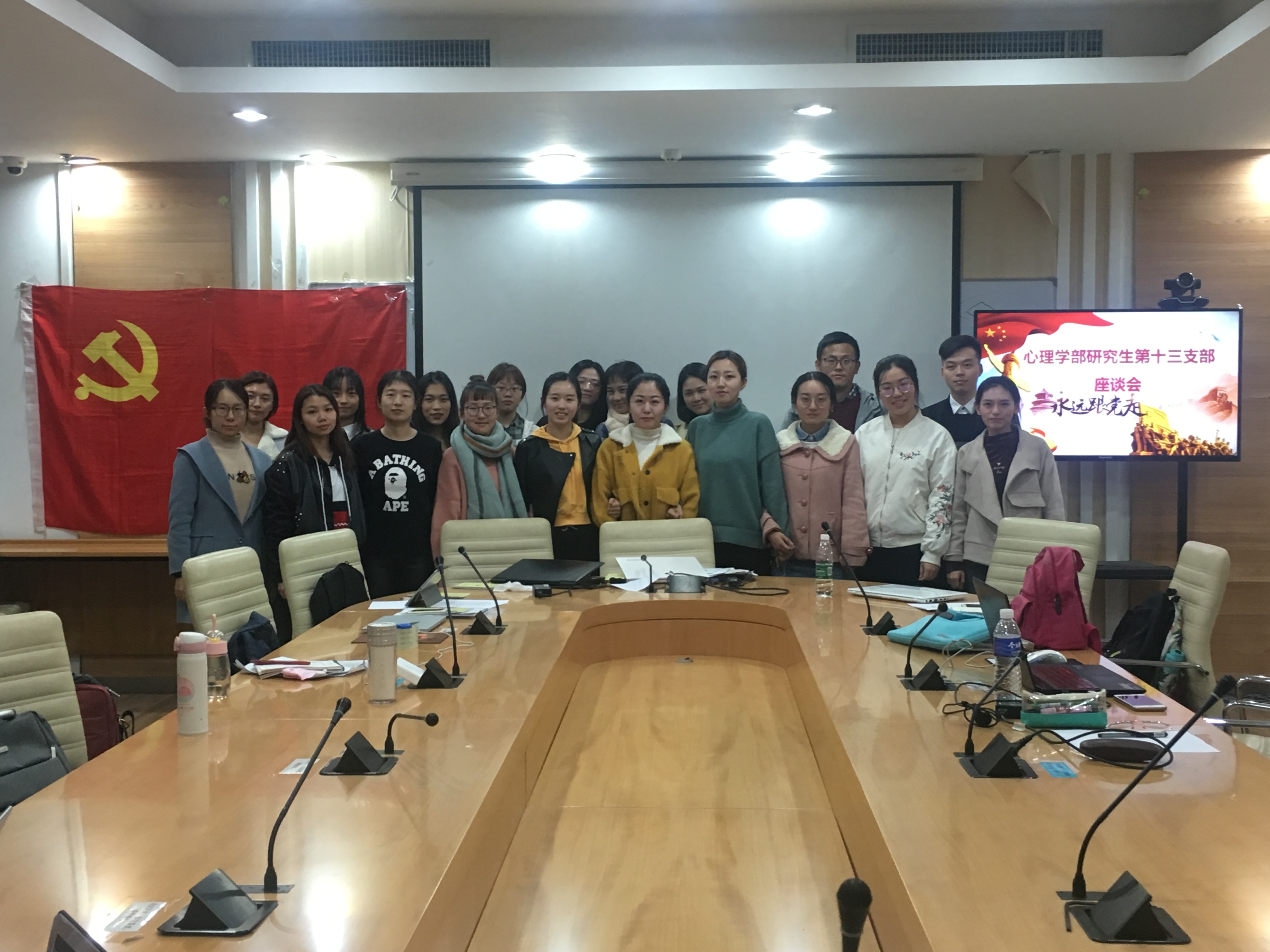 2018年10月26日晚18点30分,在后主楼1316,98色花堂 第十三党支部召开了入党积极分子座谈会。本次活动由第十三党支部党支书乔亚澜主持,宣传委员杨童和组织委员解鑫组织记录,六名同学被谈话发展成积极分子,以及党支部的其他党员参与投票。 开会前纪检委员汇报了近期党建活动出席签到情况以及大家的学时获得情况。座谈会开始,第一个被谈话的是谷梦瑶同学,她是18级MHR的研一学生,同时也是MAP联合会副主席,她首先自我介绍接着介绍了党的基本知识,说明入党条件和入党动机,同时会汇报了近期的学习工作情况以及自己的优缺点,同时支书问了一些党的相关知识:五位一体的总布局是什么?接着又问了如果需要她为党建活动献言献策有什么比较好的见解,谷梦瑶同学都流利并有想法的说了出来。 接着额于沉艳、孙小雅、张曼玉、封慰、及符薇同学分别都做了自我介绍和说明了入党动机,谈话人也对他们进行一些提问。然后由到场的所有党员同志进行匿名票决,几位同学都以出色的表现、端正的态度和积极上进的思想成功发展为积极分子并选择了各自的发展人。 此次座谈会不仅展示了近期活动情况,也成功发展了一批入党积极分子,为研究生第十三党支部涌入新的党建力量,希望他们能思想积极上进,以后成功发展成党员并为我当尽一份力。最后,所有参会人员合照留念。
