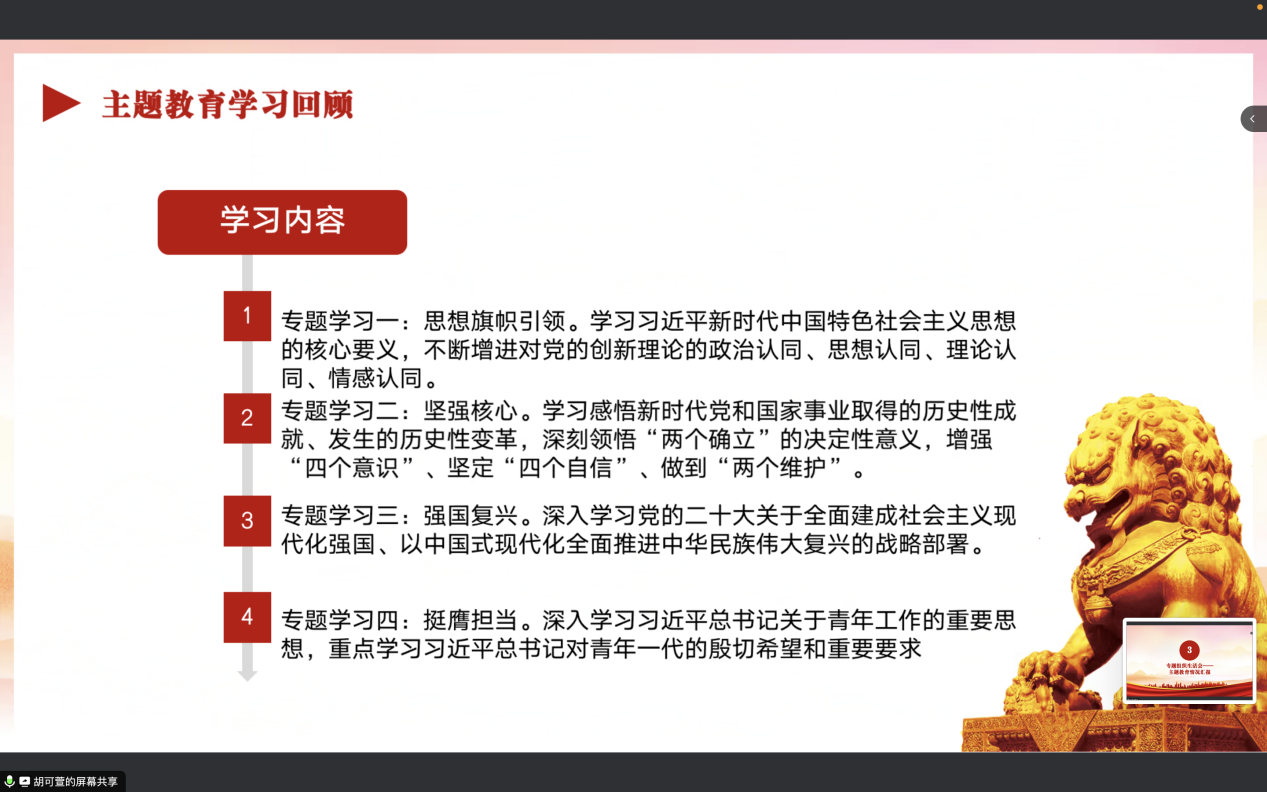 周星辰老师首先为同学们做期末考前动员,与同学们分享体验和经验。 期末动员结束后,团支部书记带领大家进行“挺膺担当”主题学习,布置“增强团员意识”大讨论安排并开展“主题教育情况汇报”专题组织生活会。 首先,我们奏唱团歌。在挺膺担当主题学习中,我们重点学习了习近平总书记对青年一代的殷切希望和重要要求,激发强国有我的青春激情,争做有理想、敢担当、能吃苦、肯奋斗的新时代好青年,在中国式现代化建设中挺膺担当。 之后,在大讨论环节中,同学们围绕“何为一名合格的共青团员”与“推动学习高质量发展中团员何为”两个核心问题,以习总书记对青年的期盼与指示为参考,思考了团员的责任与担当、可为与有为。