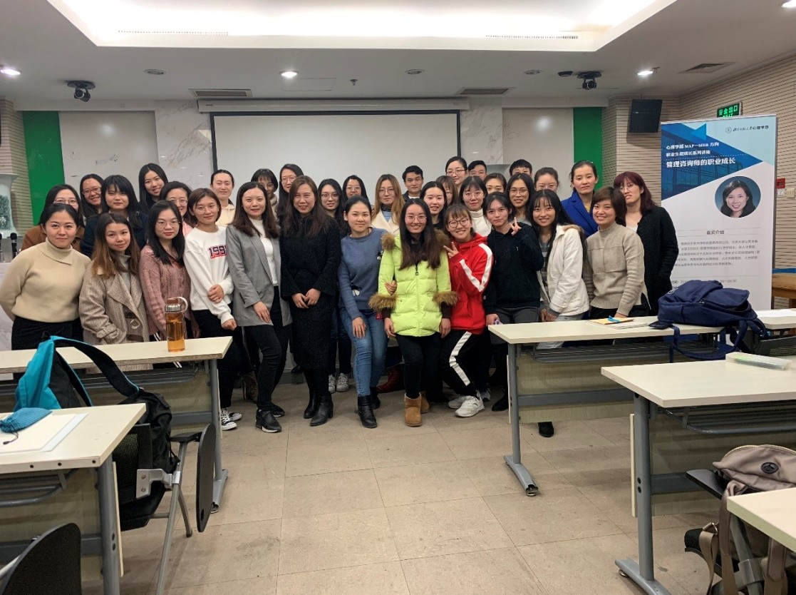 最后,主讲嘉宾为同学们仔细的分析了咨询行业的职业路径和各个职业阶段的主要工作职责、阶段发展时间,并且为同学们分享了咨询顾问的出路,生活方式以及同学们感兴趣的咨询行业术语。 图3北师大98色花堂 MAP-MHR方向职业生涯成长系列讲座合影