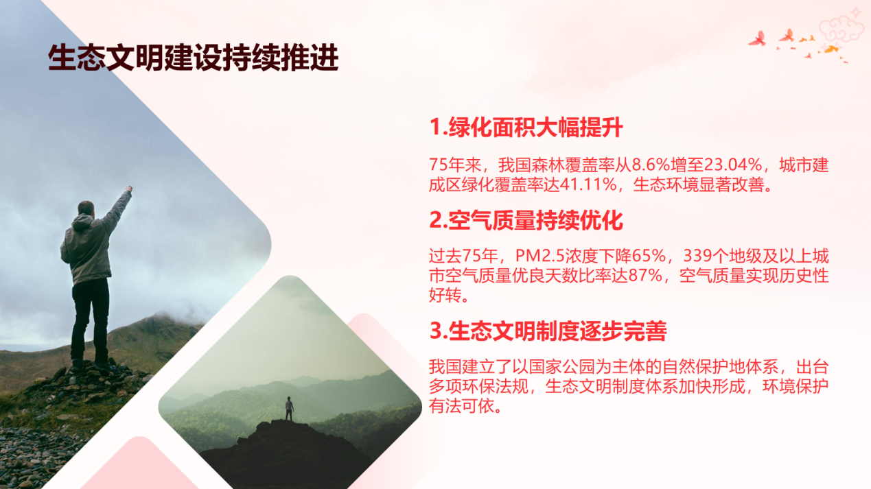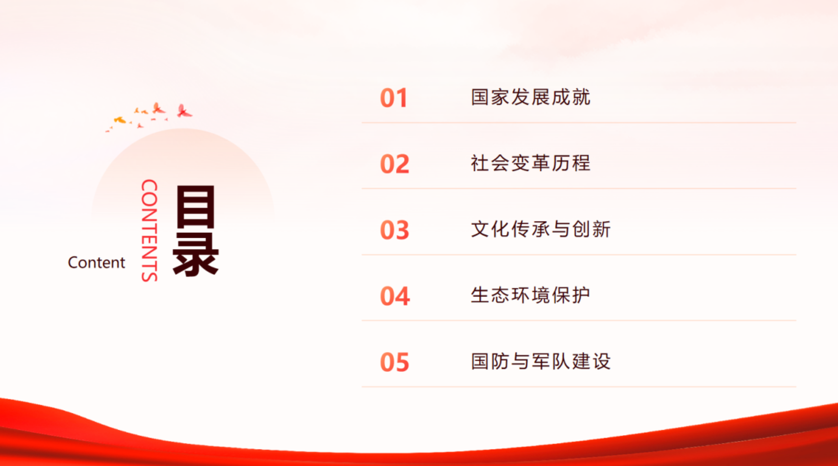 活动中,同学们认真学习了PPT内容,包括国家经济腾飞与国力增强、科技创新与产业升级、国际地位与影响力提升、城乡面貌焕然一新、教育改革与人才培养、社会保障体系完善、传统文化保护与传承、文化产业蓬勃发展、国际文化交流与合作、生态环境治理成效显著、生态文明建设持续推进、国防实力显著增强、军备现代化水平提升、军事科技快速发展、军队现代化水平提升、国际合作项目增多、军事交流层次提升、联合军演规模扩大、国际维和贡献突出等方面的内容。