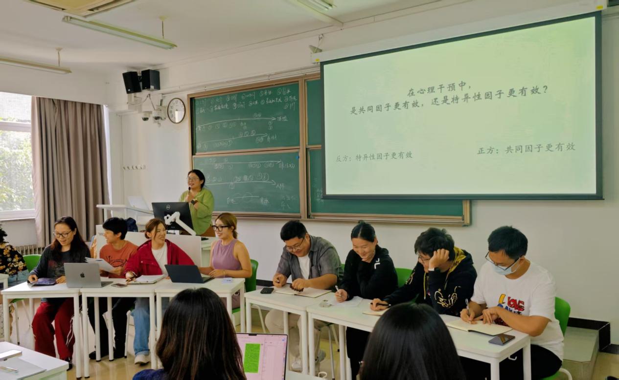 紧随班会,专业课程于一周后展开。9月20日全天,由岸本鹏子老师主讲的“开学第一课”——《高阶心理咨询理论研究专题》正式开课。课程围绕“心理咨询效果”展开,通过老师讲授、小组汇报对比各流派异同,并组织了“共同因子与特异性因子何者更有效”的现场辩论,深化了学生对疗效机制的理解。