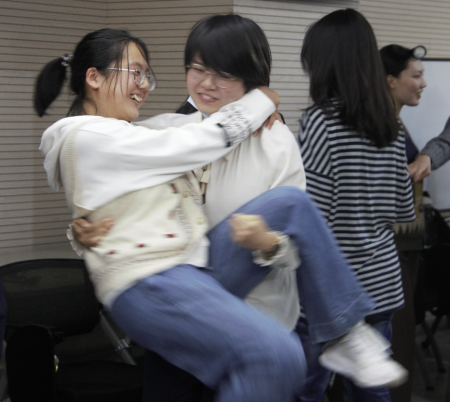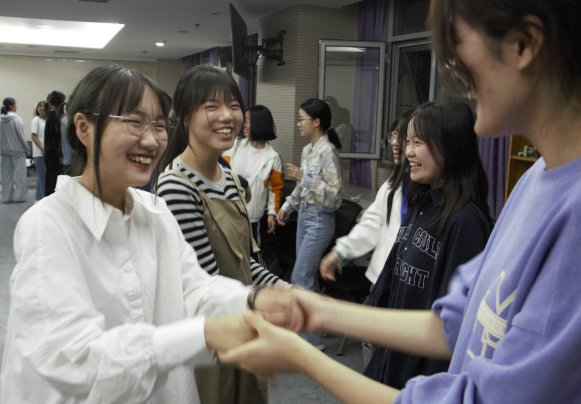 同学们进行才艺展示 第二个热身活动为“打招呼”。按照1和2报数分为内圈和外圈两个小组,俩俩形成搭档。搭档们要在老师下达口令“我和你say hello”之后,选择自己感觉舒服和安全的方式打招呼:用手指出示1/2/3/4,不同数字代表不同的打招呼方式(从1-4分别代表微笑、握手、拥抱和抱起来转一圈四个级别的打招呼方式),同学们在尝试出手后做出相应的动作,最后同学们交流“对方数字比自己高”和“对方数字比自己低”的感受。在这个过程中。同学们彼此之间都很熟悉,大部分同学都能积极活跃地参与进来,并且一开始就有抱起来赚一圈的同学。老师还精心策划了“重逢”的场景——向反方向移动相同的位置,目的是为了重逢曾经的搭档,在重逢环节中同学们会表现得更加“熟悉”,抱起来转圈的同学也越来越多。