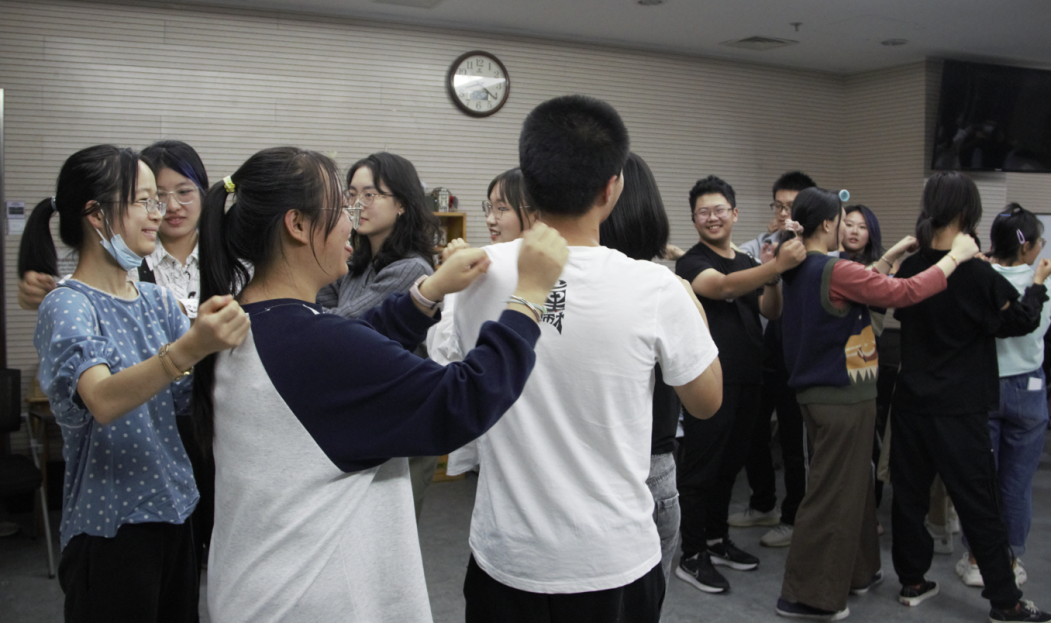 同学们进行自我分享 第四个热身活动是大雨、中雨和小雨,每一组同学围成一个圈,双手搭肩,根据大雨/中雨/小雨的指令做出不同剧烈程度的动作,每位同学都积极、活跃地参加活动,努力打开自己、建立彼此之间的关联。