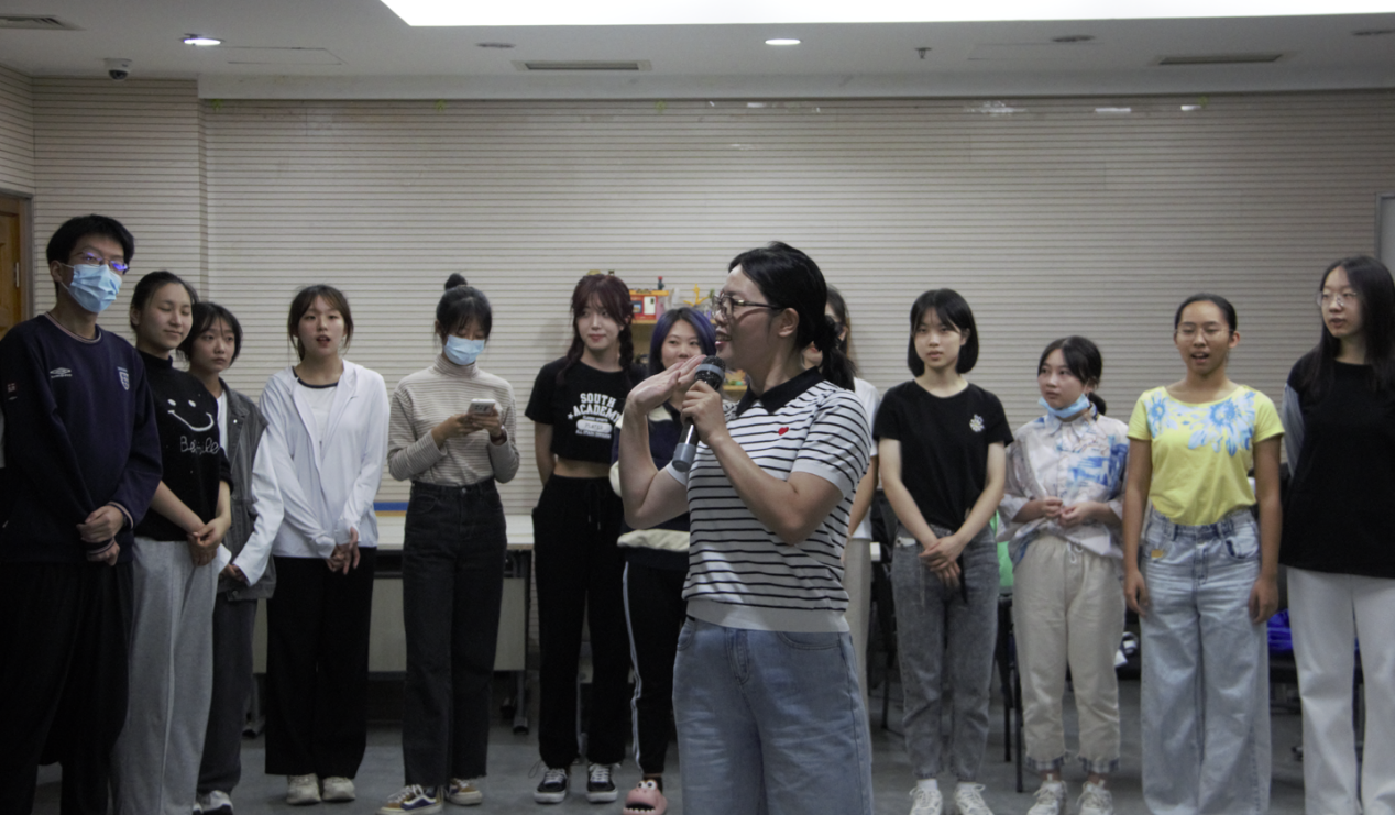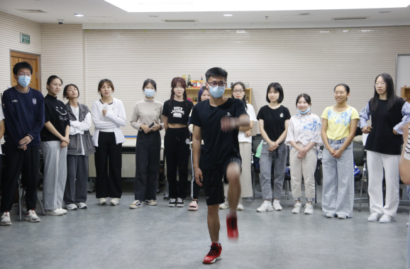 黄利老师讲述游戏规则 肢体热身活动“同频共振-捉鸭子” 迅速让大家建立联结,全班所有人围成一个大圈,然后逐个喊:抓鸭子!抓几只?抓x只!抓到了/没抓到!嘎,嘎……然后再次循环。助教进行规则展示后同学们再进行尝试。反应迟钝或错误的人要给大家带来礼物:大喊“我是明星”并与所有人击掌庆祝,周围的同学欢呼一位明星的诞生,同时选择表演节目或者进行卡同跳。起初,第一位同学跳起来说“我是一个人来的”的时候还有些害羞但是勇敢尝试,但在第一位同学开场之后同学们逐渐投入并更加主动。