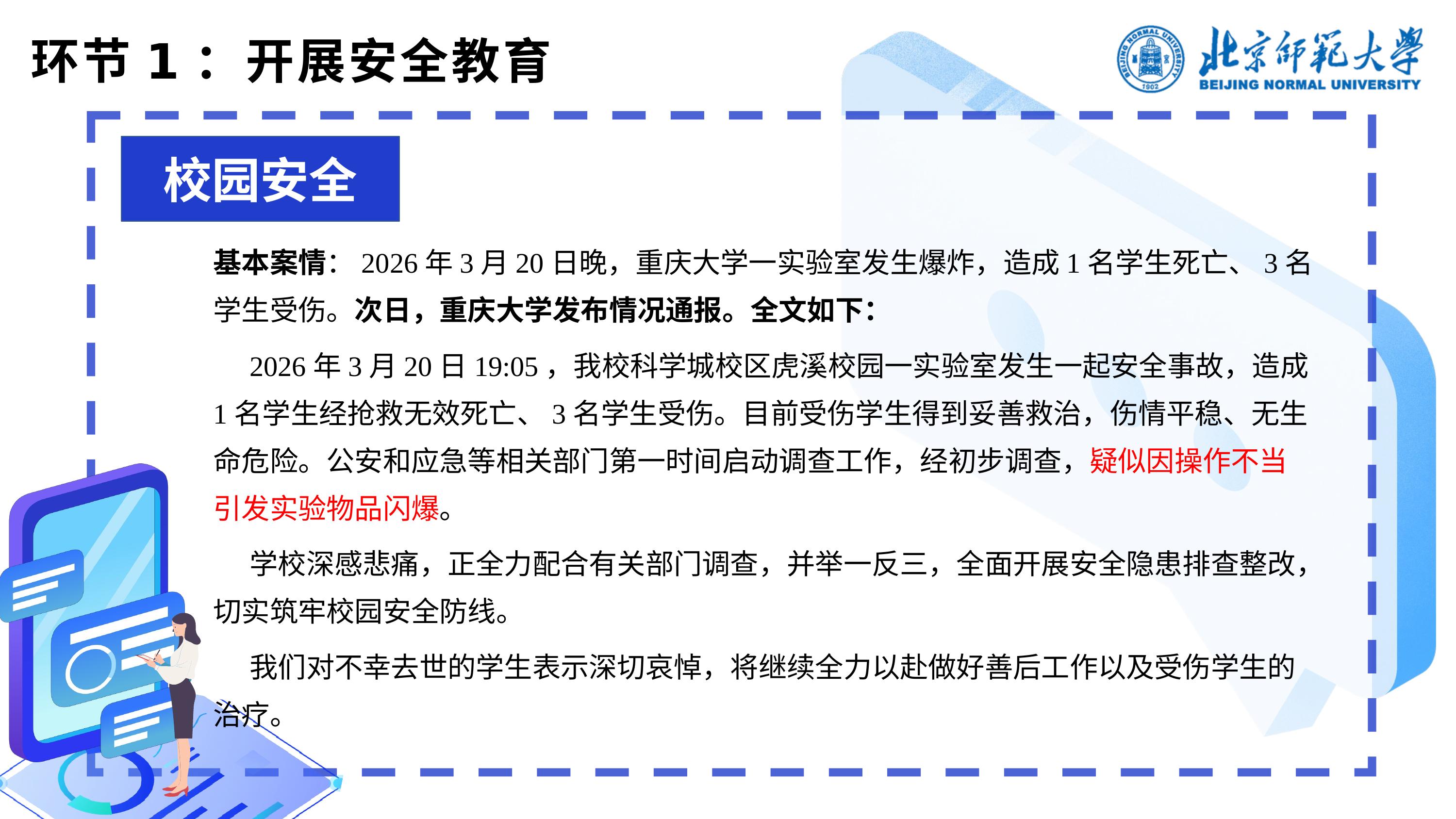 班会伊始,詹皓钧同学对上学期生涯发展活动的参与情况进行了汇总通报,提醒同学们及时核查本人签到记录,并公布了本学期生涯发展活动的预告安排,鼓励大家提前关注、积极参与,按时完成本学年至少2次生涯发展活动的要求。此外,他向同学们介绍了金丰和605流动自习室资源,方便有需要的同学合理利用校内学习空间。 随后,班会进入安全教育环节。詹皓钧同学结合近期发生在高校的真实案例,从实验室安全、消防安全、交通安全和网络防诈四个维度对同学们进行警示教育。