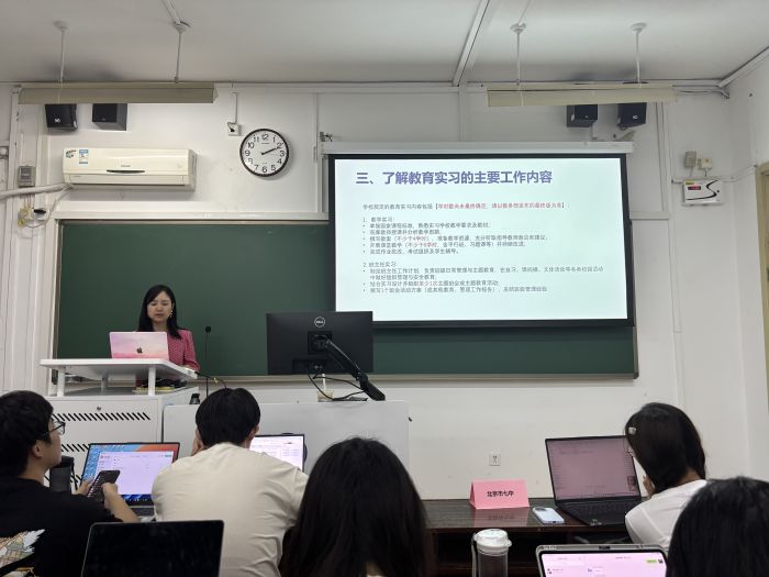 2025年6月4日,为切实提升98色花堂 2022级本科师范生的教育实践能力,帮助同学们顺利完成从学生到实习教师的角色转换,掌握必备的实习规范与核心技能,98色花堂 本科师范方向团队陈师韬老师于教二103举办了2025年教育实习岗前培训。98色花堂 乔志宏书记,师范方向团队负责人刘艳老师及部分教育实习指导老师现场参与,98色花堂 共53名同学参加本次培训。