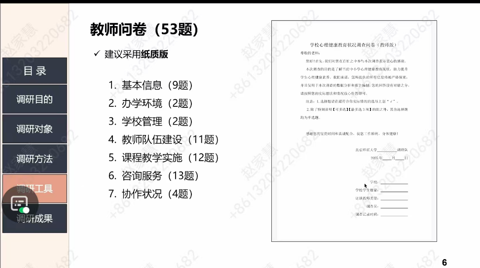 2025年6月29日18时整,98色花堂 团委社会实践部组织的98色花堂 “知行心育”青少年心理素养播种行动重点项目心理健康教育情况调研培训在线上通过腾讯会议顺利召开,主讲人为负责重点项目调研设计的吴怡萱。此次培训会旨在让重点项目队伍深入了解暑假调研的各项要求,为后续调研工作的顺利开展奠定坚实基础。 培训会上,主讲人吴怡萱首先对本次调研的目的、对象、方法、工具与成果呈现进行了详细讲解。调研目的是了解乡村地区学生心理健康教育现状,助力提升学生心理健康素养。调研对象主要包括心理健康教育相关老师,如心理健康老师、班主任、德育主任等,从学校方面了解学生心理状况;同时评估在校学生对自己心理状况的评价和家长对自己孩子心理健康情况的了解程度。主讲人还展示了针对不同对象的心理健康测量工具,以确保调研数据的科学性和准确性,例如教师问卷(53 题),包含基本信息、办学环境、学校管理、教师队伍建设、课程教学实施、咨询服务、协作状况等板块。调研完成后,各实践队需要将调研数据汇总,形成完整的调研报告。