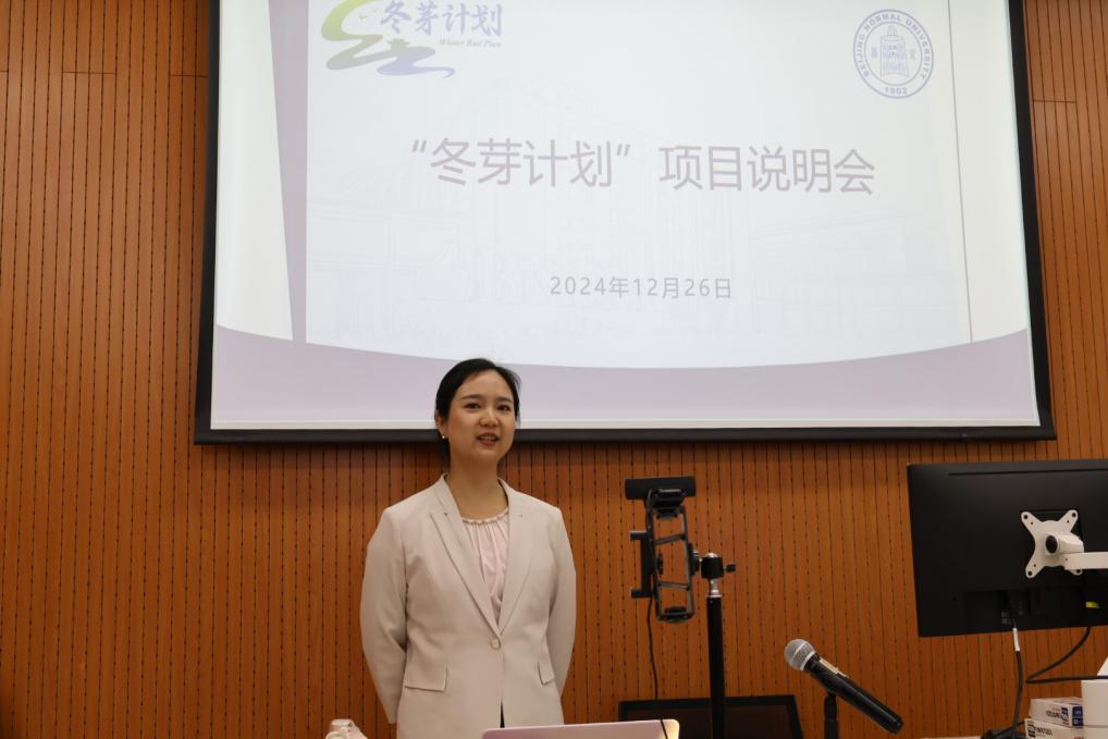 之后,陈老师又就项目整体框架、时间安排和整体的工作流程进行了系统介绍。陈老师指出,项目从1月份开始启动,2月份开始各项工作,包括来访者招募、筛选培训、访谈、评估、干预等环节,持续到7月,期间有不同团队分工协作。各工作组负责人代表周涵琪、侯雯婷、吕依静、樊世奇等依次对“冬芽计划”项目中联络员、陪伴员、咨询师、访谈员以及质性研究助理的职责和工作安排进行了详细的介绍。