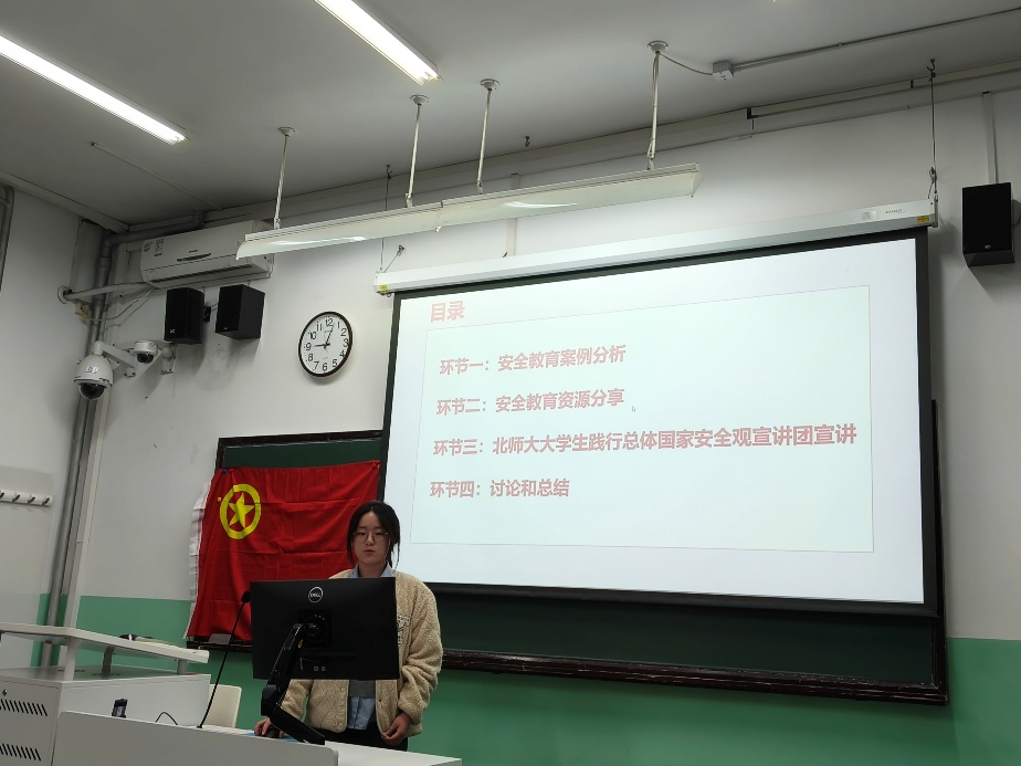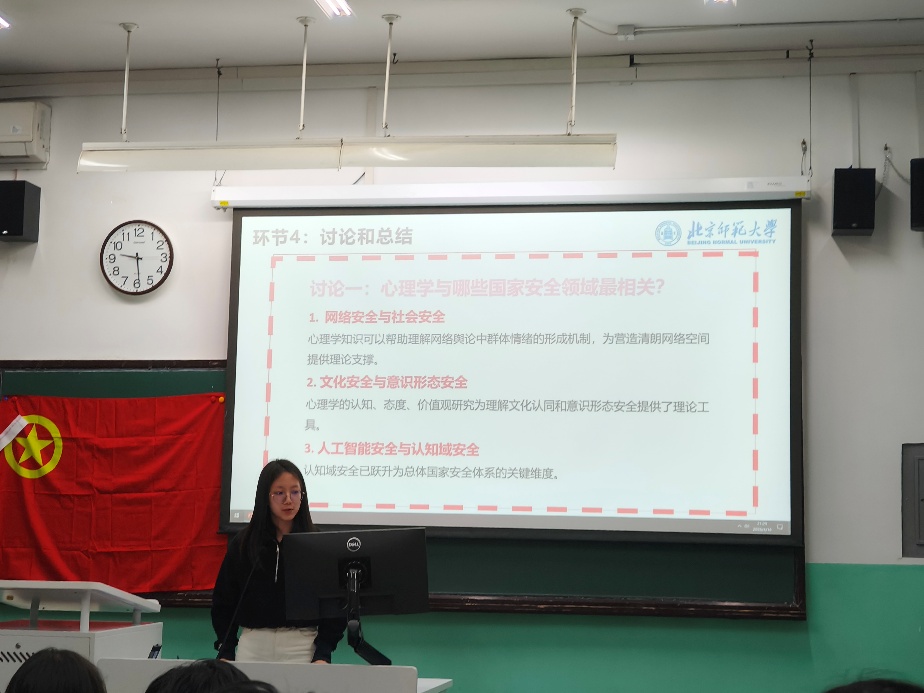 最后我们进行了讨论和总结。团支书陈嘉祺同学带领同学们围绕“心理学与哪些国家安全领域最相关?”以及“校园生活中哪些行为可能触及国家安全?”这两个问题展开了讨论和分享。大家对于心理学和国家安全的联系有了进一步的认识,也懂得了作为一名大学生能够维护国家安全的方式。