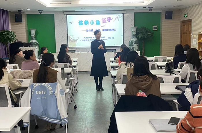 当晚18时30分在后主楼1318报告厅,陈萍老师为同学们带来了题为“那条小鱼在乎——做有趣、有用、温暖的心理人”的主题讲座。在讲座中,陈老师结合多年一线经验及感悟,深入浅出地讲述作为一线中小学心理教师会面临的诸多挑战,同时勉励同学们将心理学所得所思作为工作的法宝,以自己的力量帮助有困难的同学。
