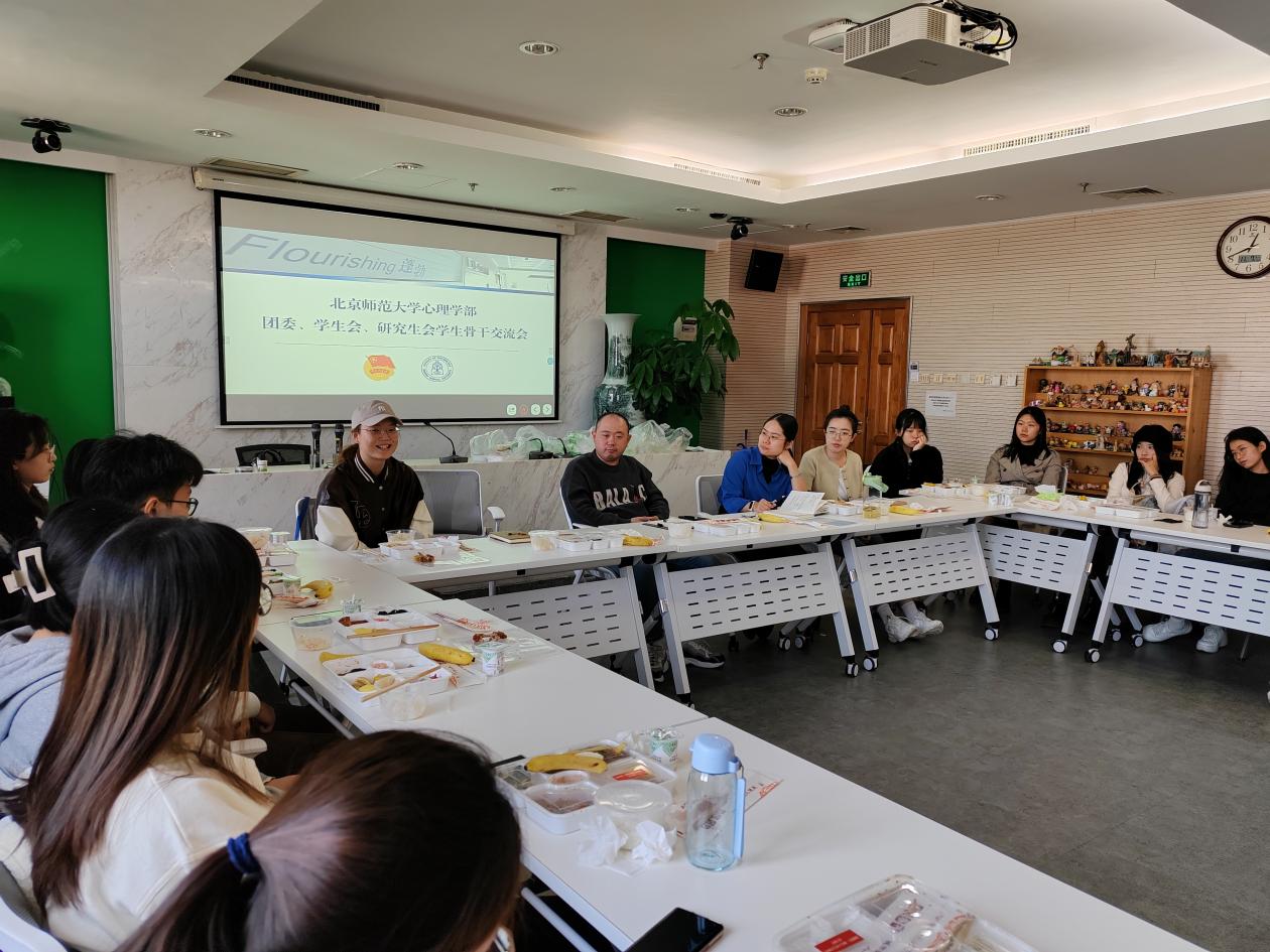 党委副书记史佳鑫老师分享了自己学生时代的学生工作经历,并带领现场学生骨干们以自我介绍和工作体会分享的方式开展团体破冰。曹昌健老师、刘佳辉老师、梁静老师依次分享了学部团学研学生组织的历史,表达了对本届学生骨干的期许,希望团学研组织之间能够打破界限,多开展工作交流和工作共建,共同做好学部学生群体的引领与服务。 其次,史佳鑫老师提出了“学生骨干应履行的职责”和“学生骨干如何做好思想引领作用”两大议题,现场师生们共同进行了热烈讨论。在探讨“学生骨干应履行的职责”时,同学们表示,一是要坚持“为人民服务”为宗旨,做好学生群体的服务工作,满足同学们在学习生活和情感归属上的需求;二是要做好老师与同学们之间的桥梁作用;三是要以实践行动回应社会对心理学科的需要;四是要在工作中锻炼自我,提升自我,成就自我;五是做好学生组织内部的建设。在探讨“学生骨干如何做好思想引领作用”时,师生们表示,要充分发挥学生骨干的朋辈榜样作用,在思想上可以结合国家和社会对心理学科的需求提供方向指引,在方法上可以注重工作要求指引和制度建设,在内容上要加强思想引领活动的实效性、针对性和趣味性,以此吸引同学们参与。