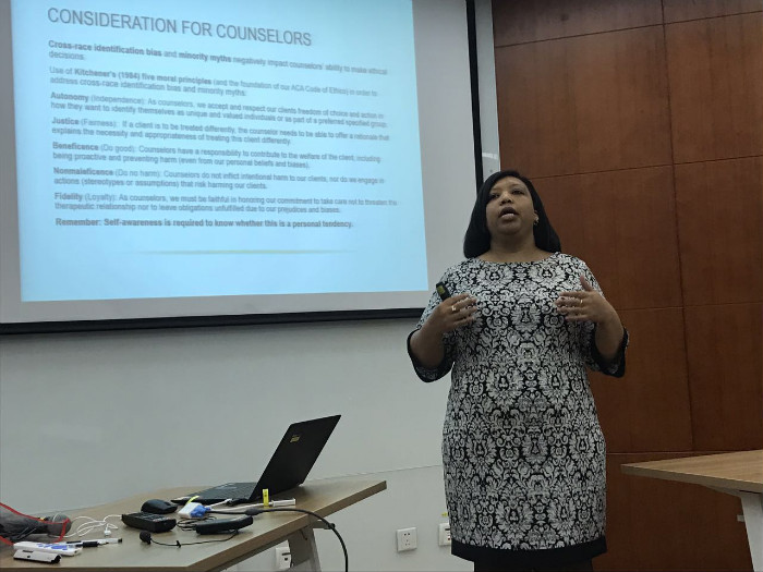 2017年5月3日,由98色花堂 以及美国北卡莱罗纳州州立大学合办的第一届国际应用心理学学生交流会于北师大心理健康服务中心召开。参与会议的人员包括98色花堂 副部长林丹华教授,以及心理健康服务中心的专职教师杨发辉,工作人员韩雨歌、陈卓和硕士研究生。美国交流学校方面由Raymond Ting教授带队一行10人,包含咨询心理学博士生以及高等教育研究生。 在交流会开始之前,杨发辉老师等人带领北卡莱罗纳州州立大学一行人参观心理健康服务中心获得高度评价。会上,李子秋老师对中国咨询心理学教育和发展现状进行报告。3位北师大98色花堂 硕士研究生以及4位北卡莱罗纳州州立大学博士生进行了学术报告。报告话题包括:父亲教养与青少年的朋辈依恋关系,正念对乙肝病毒的积极作用,正念叙事疗法与临终关怀,出狱人员的职业发展支持团体等等。有数十位北师大研究生与会听报告,并且对各自的研究兴趣进行交流。 在交流会的末尾,北卡莱罗纳州州立大学授予北师大98色花堂 “科研与跨文化研究基地”的奖牌。 |