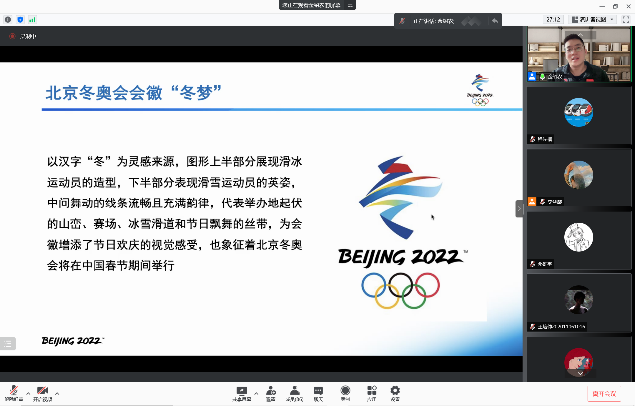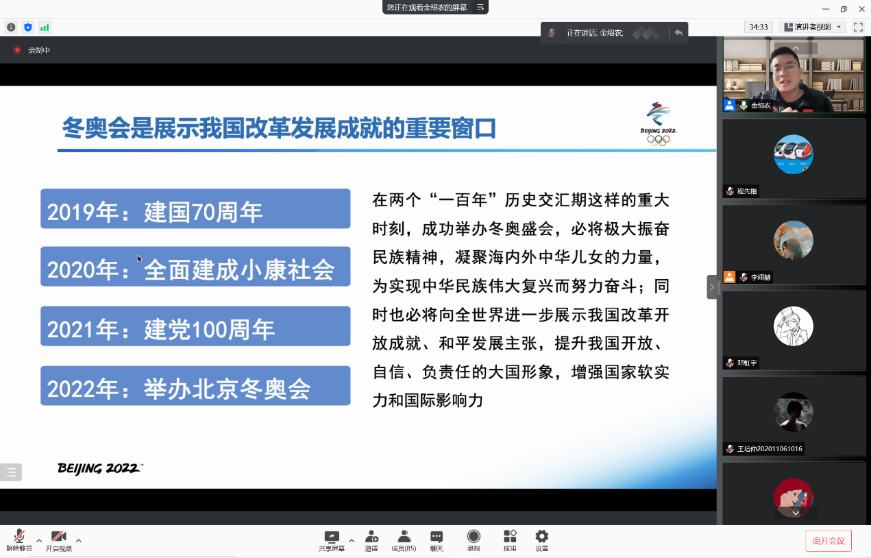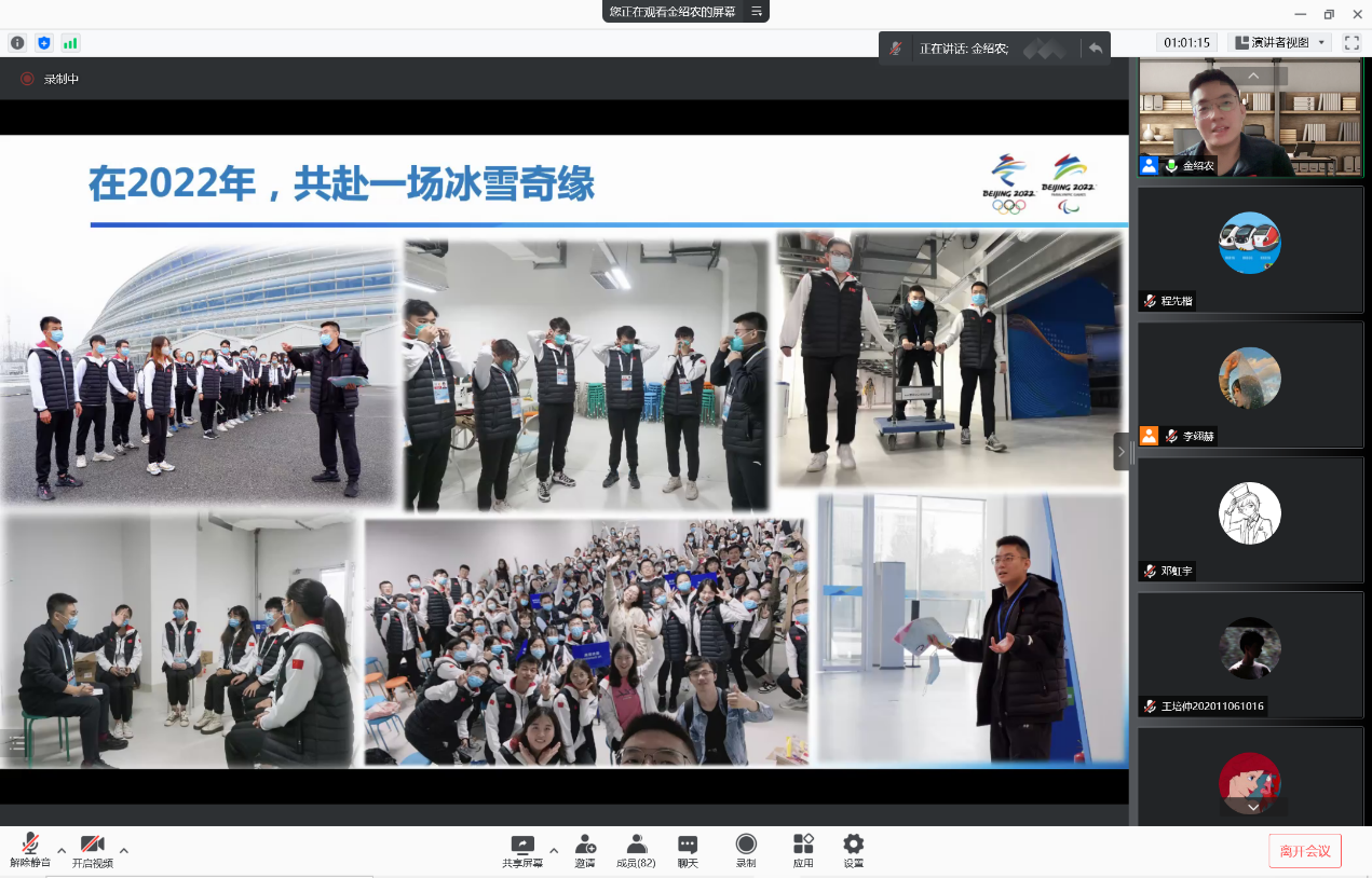 随后,金老师指出了冬奥会的重要意义,冬奥会是展示我国改革发展成就的重要窗口,是开展大国外交、促进世界和平的重要舞台、是传播中华文明、弘扬新时代精神的重要载体,是推动城市和区域协同发展的有利抓手。同时也能进一步提升延庆、张家口地区的经济社会发展水平,满足群众美好生活需要,不断提升市民健康水平。