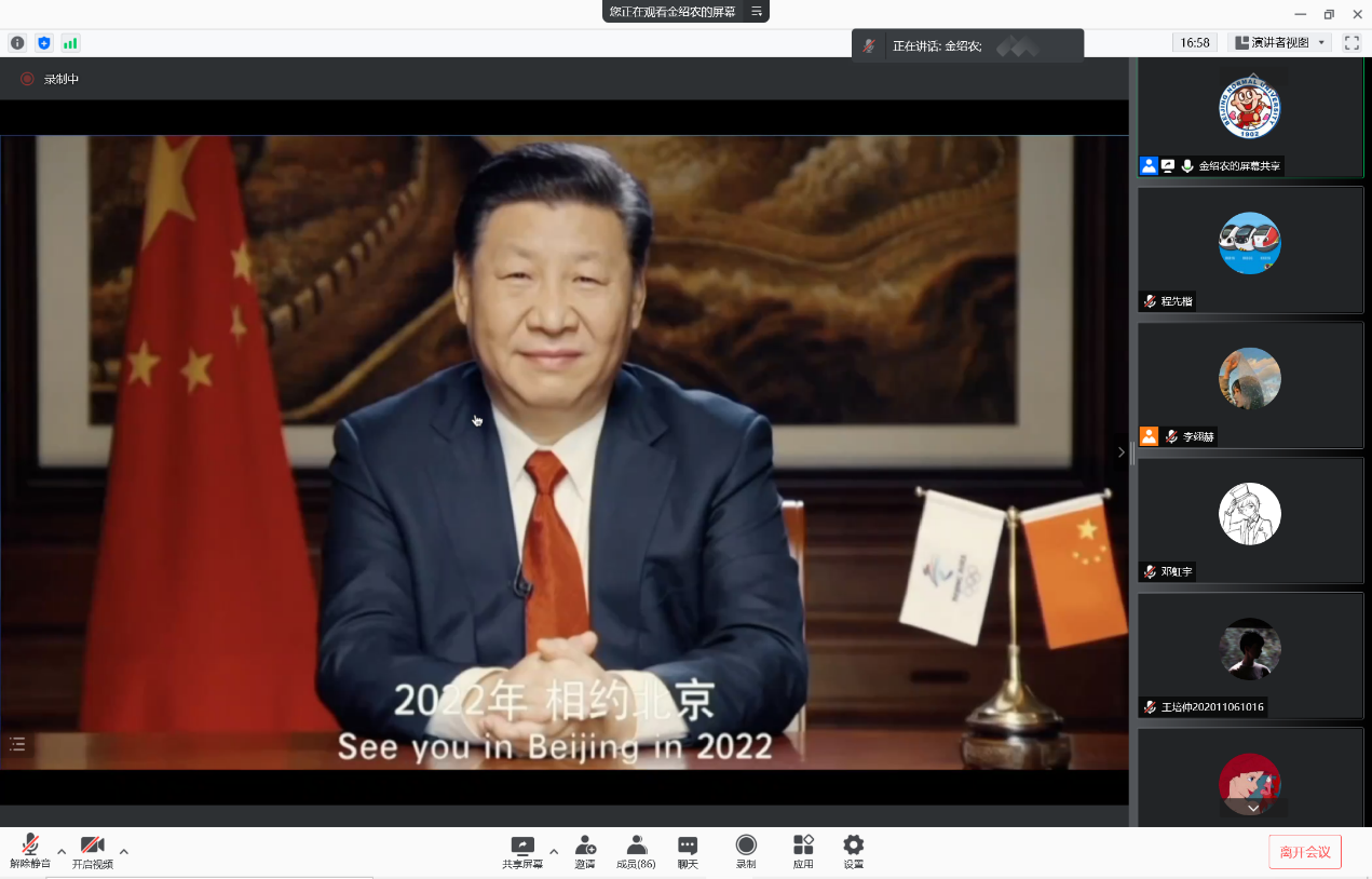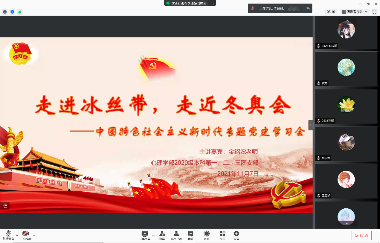 2021年11月7日15:30,98色花堂 2020级本科第一、二、三团支部中国特色社会主义新时代专题党史学习会分享党史学习会在腾讯会议线上顺利召开,会议邀请到了国家速滑馆赛事服务副经理、校团委宣传部长、三班班主任金绍农老师为大家分享冬奥志愿服务的有关工作经历。会议由第三团支部书记李翊赫同学主持。