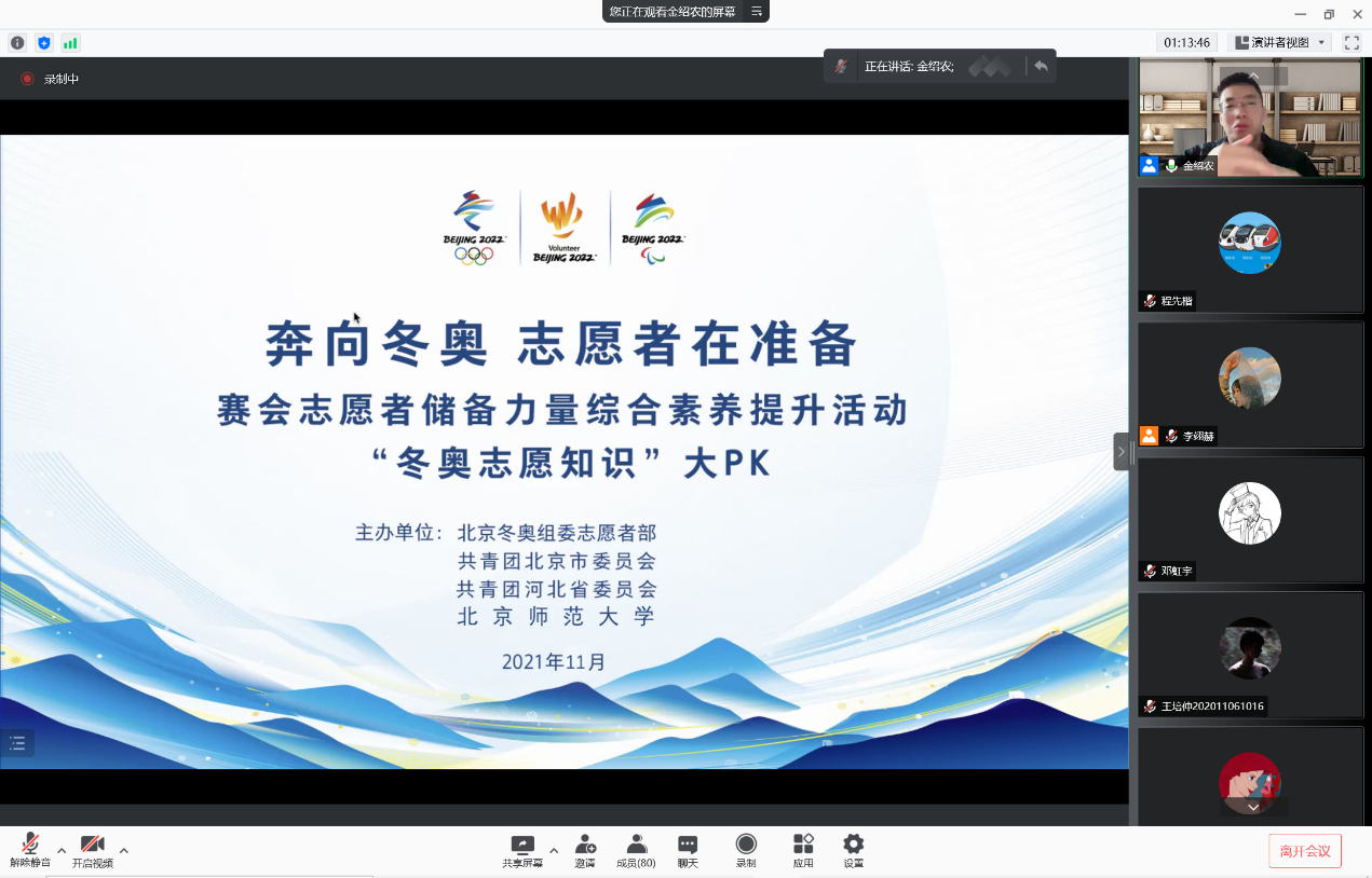 然后,金老师介绍了我校参与冬奥志愿服务的情况,在2022年北京冬奥会志愿者工作中,北师大主责冬奥会北京赛区唯一新建的冰上竞赛场馆国家速滑馆的志愿者工作。在本次冬奥会的筹办过程中,作为“红色师范“的98色花堂