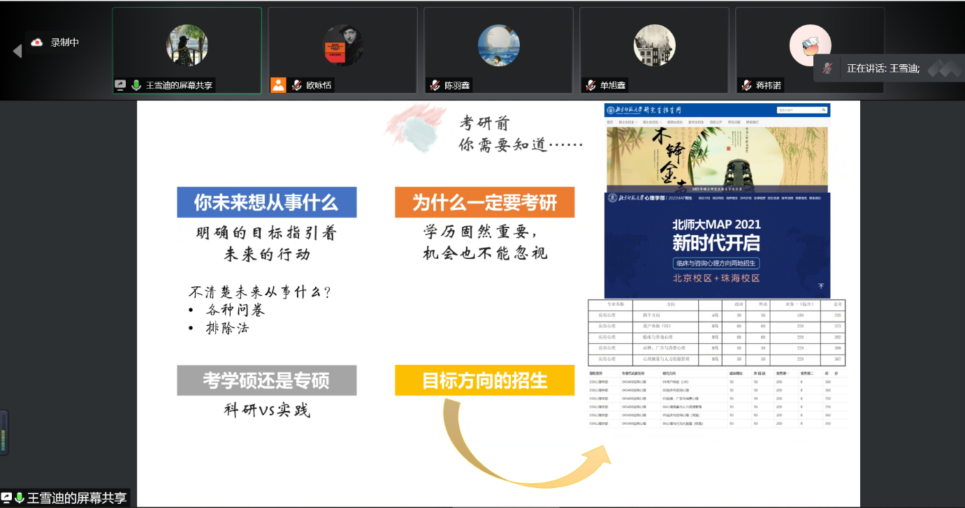 2021年4月4日下午13:30-15:10,学业辅导室考研经验分享会于线上举办。本次分享会邀请到了今年考研上岸的张凤翔、霍恩迪、陈清莲、王雪迪、魏怡冉和朱依灵同学,为2018级备战考研的同学解答了关于考研的种种疑问。近40名同学在线上参加了分享会。 首先,主持人介绍了参加经验分享会的六位嘉宾。随后,张凤翔、霍恩迪和陈清莲同学逐一对学校和专业选择、学硕考研的科目和题型、备考时间线、备考资料、备考技巧和心路历程等进行了分享。朱依灵同学分享了自己考研过程中的复习资料。分享过后,同学们向嘉宾咨询了关于选择导师、考研难度等问题,嘉宾们对这些问题做出了详尽的解答。 接着,王雪迪和魏怡冉同学为大家进行了专硕的备考介绍。两位同学都建议大家在备战考研之前思考自己考研的动力来源,随后详细介绍了咨询专硕的考纲、备考方式和时间线,并讲述了自己的心路历程。在提问环节,嘉宾们也逐一解答了同学们关于专硕的学制和就业等问题。