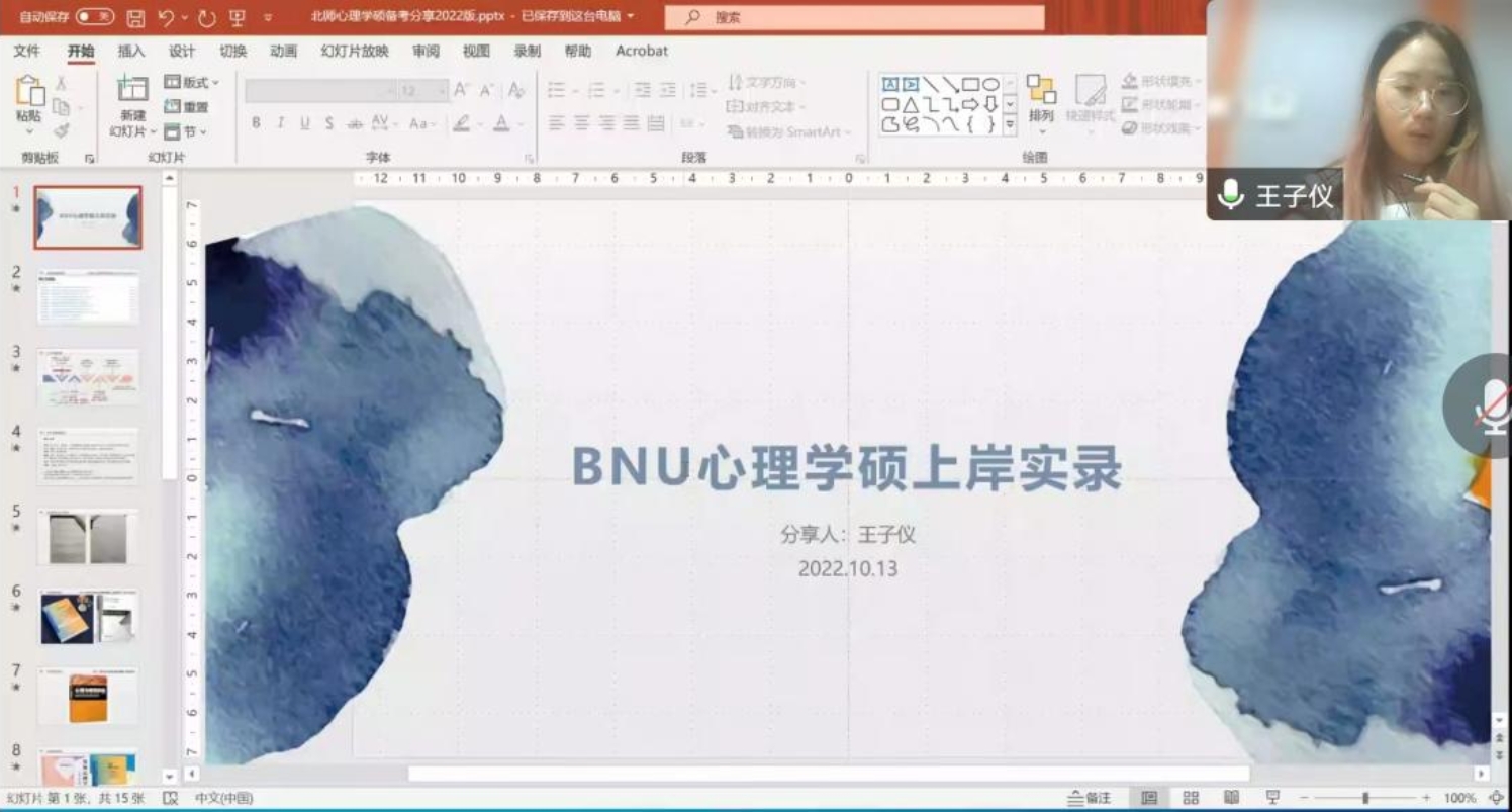 史佳鑫老师(左)和张照鹏老师(右)在和同学们分享分享考研经验 接着,张照鹏老师根据同学们的反馈,分享了同学们目前的报考学校及方向,同时邀请了两位考研成功的同学分享经验。 首先是成功上岸20级北师大心理学硕的王子仪同学为大家详细介绍了考研的整体时间流程。同时,提示同学们关注目标院校往年的考研信息,提供了自己的备考建议。接着,姚远同学结合自己的亲身经历,倾囊相授自己的复习技巧,强调在复习中需要保持良好心态,寻找合拍的搭档共同备考。