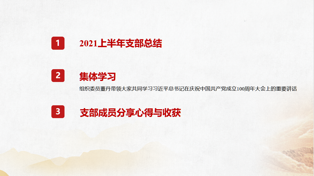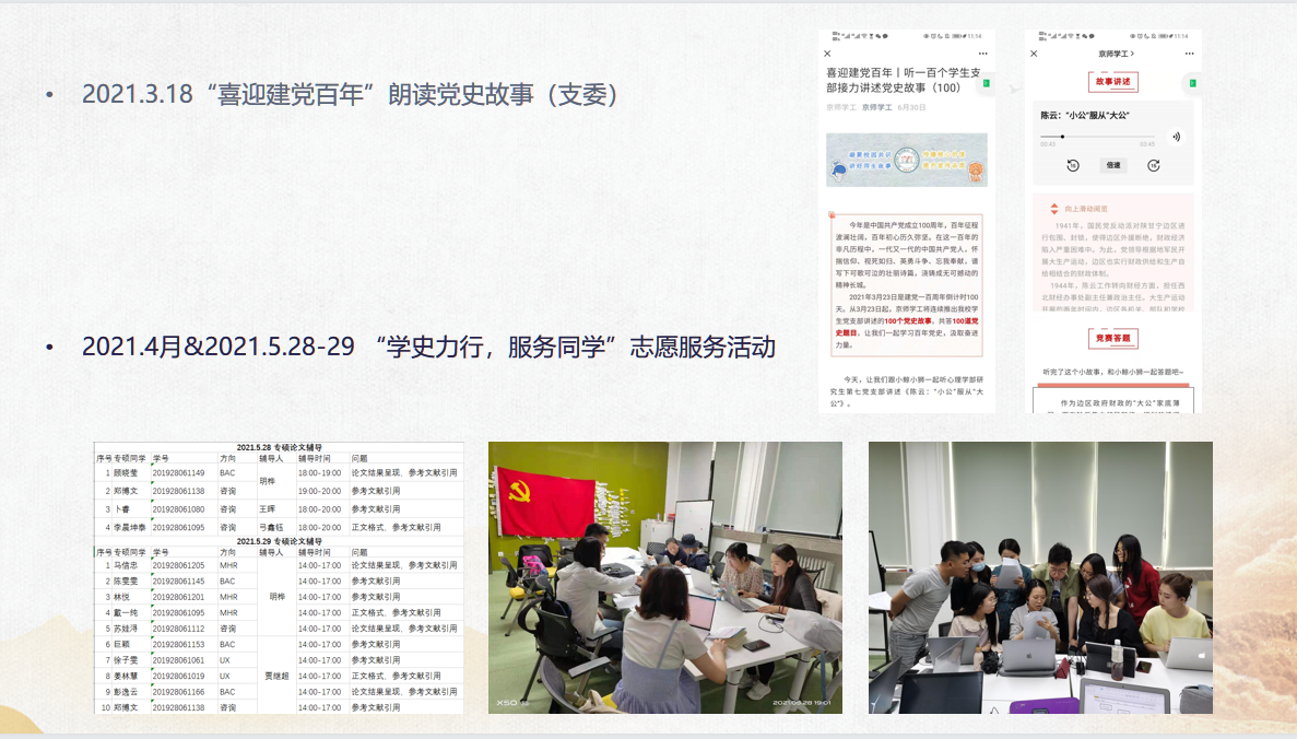 2021年7月17日上午,研究生第七党支部通过线上会议的方式,开展党史学习教育专题组织生活会。会议由三部分组成:2021上半年支部总结、组织委员董丹带领支部内党员共同学习“习近平总书记在庆祝中国共产党成立100周年大会上的重要讲话”以及支部成员分享心得与收获。 首先,党支部书记明桦对支部的党员发展、党费缴纳、“心党员”公众号撰稿以及党员信息管理和学时统计等工作进行总结。具体而言,2021上半年,研究生第七党支部共计开展“看两会主题党日活动”、“喜迎建党百年”朗读党史故事、“学史力行,服务同学”志愿服务活动等活动7次。 其次,组为委员董丹同志带领支部党员学习“习近平总书记在庆祝中国共产党成立100周年大会上的重要讲话”。她带领大家回顾历史,讲述了为了实现中华民族伟大复兴,中国共产党团结带领中国人民,解放思想、锐意进取,创造了改革开放和社会主义现代化建设的伟大成就。展望未来,她为大家讲述了习近平总书记强调“九个必须”。 最后,通过此次组织生活会,一方面,支部的党员同志对支部的工作有了更深刻的了解,为未来党支委进一步完善党支部工作奠定基础。另一方面,通过学习七一讲话,支部内的同志进一步深刻的认识到:伟大梦想,伟大工程,伟大事业,伟大梦想需要优秀的共产党来实现,为此,所有党员同志需要自我净化、自我完善、自我革新、自我提升,保持和发展党的先进性。 供图:研究生第七党支部 供稿:研究生第七党支部 |