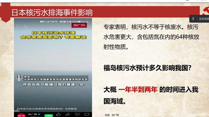 然后,陈璐同志对日本核污水排海事件进行梳理,讲述了该事件的起因、经过、结果并普及了相关科学知识,让同志们对该事件有了更加充分的理解。