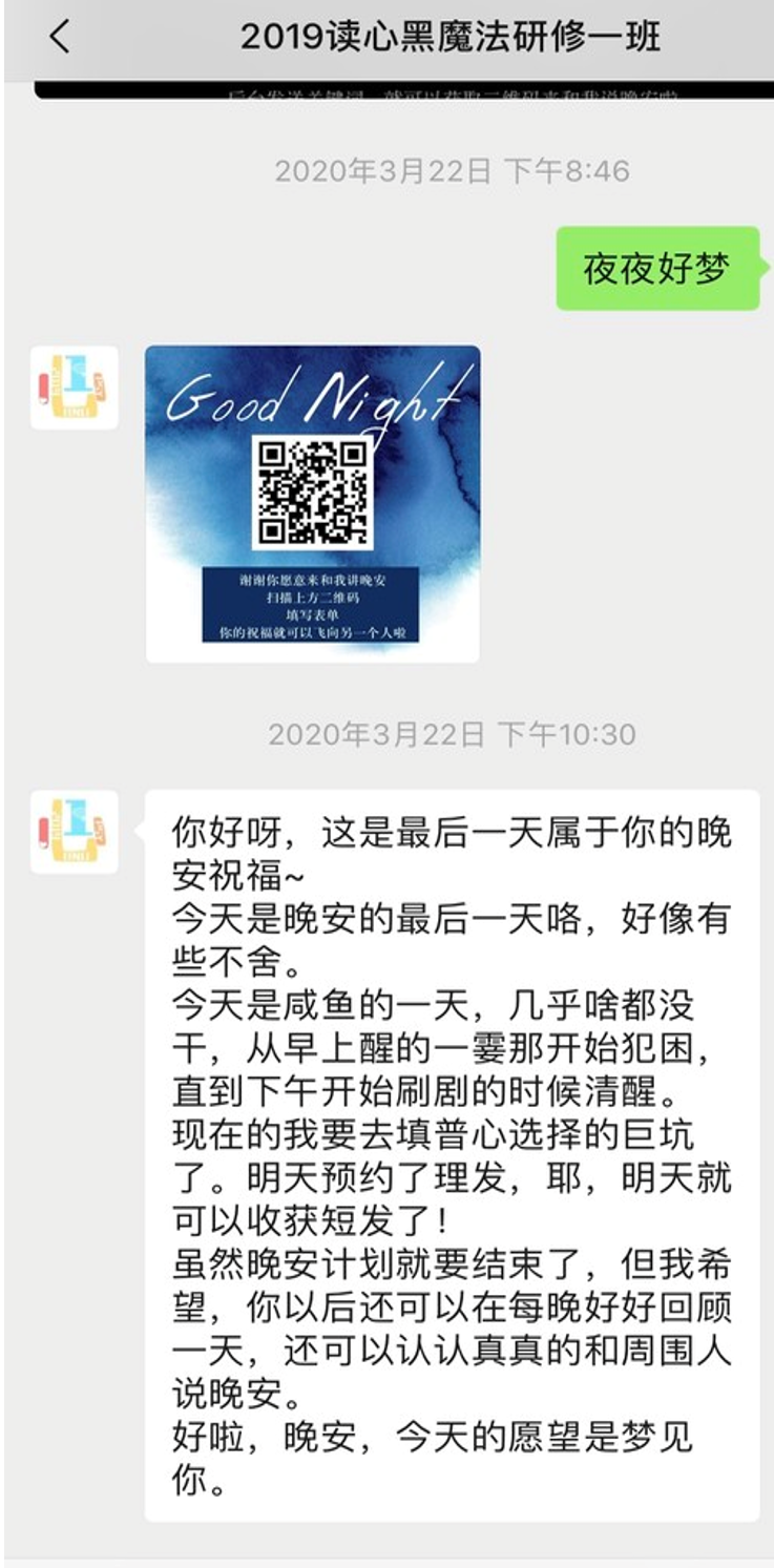图中为最后一天晚安活动时后台自动回复的截图 文稿|柳笛