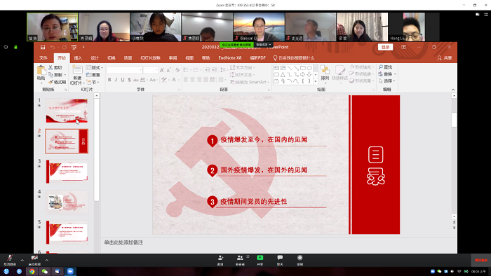 由于本支部目前有6位党员正在美国或英国进行联合培养,因此,综合考虑时差,2020年3月27日晚9点,研究生第九党支部通过ZOOM在线会议平台召开了2020年春季第一学期组织生活会,支部书记笪姝主持了本次会议。 本次组织生活会主要分三个部分:(1)疫情期间身处国内的党员们分享自己的所见所闻所感;(2)疫情期间身处国外的党员们分享自己的所见所闻所感;(3)大家探讨疫情期间党员先进性的思考。 首先,党支部书记笪姝分享了疫情自1月底在国内爆发以来,民众的心态随着舆论波动并产生的一些不理性情绪和想法,强调在新闻和舆论的发酵中保持理性的重要性,传递不将个别的人性弱点视为国家或制度堕落的观点。宣传委员李晓燕也分享了她在李文亮事件中观察到的不理性的情绪激荡,号召大家不以偏概全,维持理性和客观。梁媛同志则从社会心理学的角度发表了看法,她认为在疫情中看到了老百姓积极配合管理,社区工作者有序地进行网格化管理,从中看到了国民素质的提高;此外,舆论的监督作用增加了民众对政府的监督,促进了政府执行力和透明度的提升,有助于增加对政府的信任度;此外,她认为民众在网络时代下,逐渐在培养批判的思考能力,更加合理地监督政府。 身处国外的党员们也积极发言,分享了自己的感受。肖丽娟同志分享过了她对中英两国制度差异的感受,通过比较,她认为中国的国家政策让民众安心,身为一个中国人感到非常骄傲!此外,她表示正如制度差异,人和人的差异也时刻存在,要相互包容,相互尊重,一方面需要借助舆论监督政府,另一方面也要理解特定岗位的工作者所面对问题的复杂性。张庆垚也分享了他在Twitter、Facebook上看到的一些反华言论,表达了他对通过网络控制的方式来保持国内民众的凝聚力的认同,以及对外交部发言人赵立坚勇敢发声的支持。李媛茜也分享了自己在英国的感受,以及自己在一个文化多元的团队中感受到的民族间的包容。 姚小喃、马姗杉、史光远等同志也在组织生活会中积极发言,讨论气氛热烈,晚上10点40分,本次组织生活会在大家意犹未尽中结束。希望全球各国早日战胜疫情! |