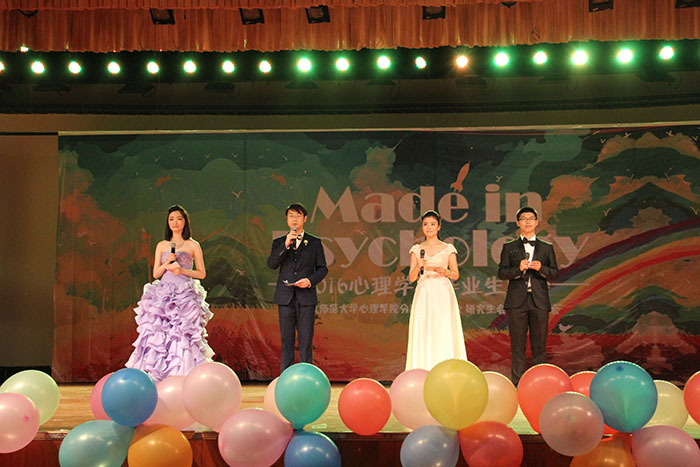 2016年5月28日晚7点,“made in psychology”——心理学院2016届毕业生晚会在学生活动中心隆重举办,心理学院2016届毕业生们迎来了一场属于他们的送别盛会。院长刘嘉、分党委书记乔志宏、分党委副书记王瑞敏、教务办公室主任邢爱玲、分团委书记史佳鑫、李虹、胡清芬、黎坚、曹昌健、李昕益、张晓娜、王娟、李爽、崔艳丽、刘振华等老师出席,毕业生张笑然、黄珊、邓衍鹤、方昱沣主持。 Mayo乐队的开场节目《挣脱》首先点燃了晚会火爆的气氛。晚会分为三个板块进行。在第一个板块“打磨岁月”中,《缘来是你》、《有点甜》和《You raise me up & Memory》等歌曲给全场带来了一场听觉盛宴。史傲雪、赵健宇等同学的《Try everything》和13级学硕带来的《HAN风》两个舞蹈持续推动现场气氛。第二个板块“整装待发”中,唐淼、王莹、韩璐的《棠梨煎雪》与张乔茜、方昱沣等同学的《你曾是少年》款款动人、余音绕梁,张文、洪韬的宅舞《Bilibili》夺人眼球,大宣宅帝国带来的小品《打倒大魔王》也博得了阵阵笑声。之后是抽奖环节,主持人从对毕业生的留言中抽取了八条并在晚会后为幸运的留言者送上了精心准备的礼品。第三个板块“闪耀未来”中,舞蹈《大王教我打排球》将全场气氛推向高潮,《直到世界的尽头》、《We Are Young》、《突然好想你》等歌曲也精彩万分。最后,由2016届毕业生共同带来歌曲《We Are Psychers》和黎坚老师深情献唱《凤凰花开的路口》,感动全场,为晚会节目画上了圆满的句号。 晚会过程中穿插了毕业生视频和老师的祝福视频。毕业生们在视频中回首过去、展望未来,讲宿舍糗事,分享自己的遗憾,有对青春的缅怀,有面临分离的不舍,也有对未来的憧憬期待。老师们表达了对毕业生的期望,并希望他们不忘初心,继续前行。老师们的祝福更是深深地触动了毕业生的内心。 晚会结束后,全体师生合影留念,纪念在师大共同度过的美好时光。相信每一个心理制造的同学们将会前程似锦,成就未来道路上更美的风景! 如需红毯照片,请点击//sdyp.98shtvip.org/shareFolder/92690001/BF9x9DuP7下载。