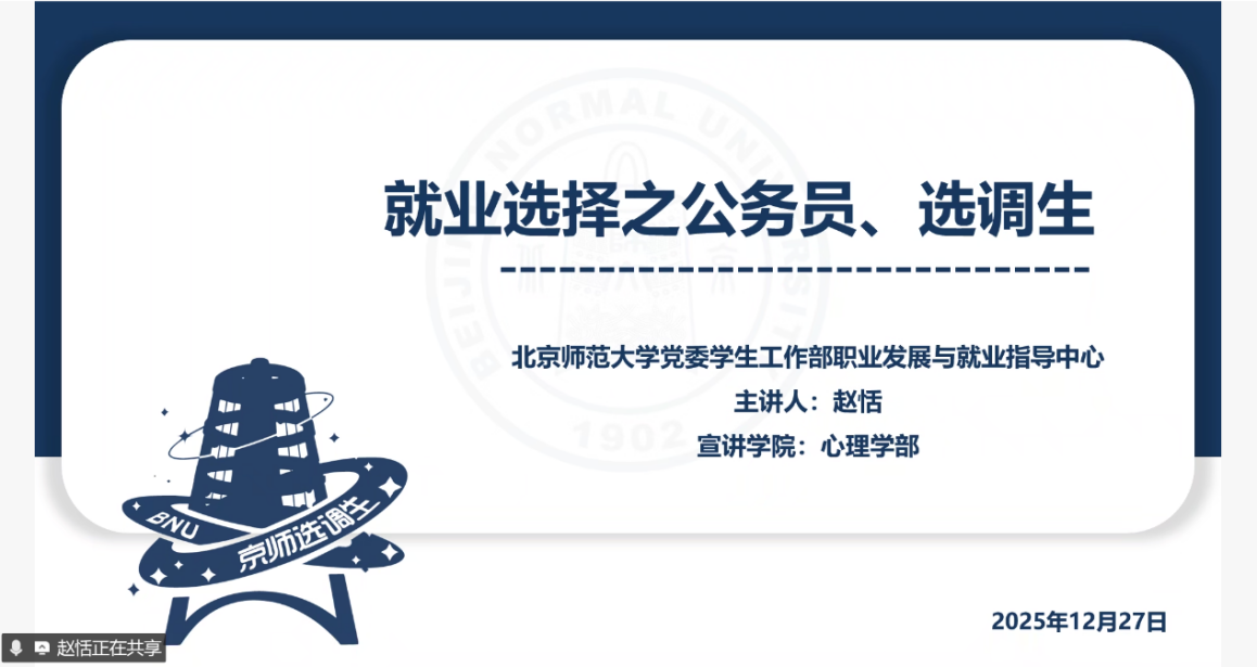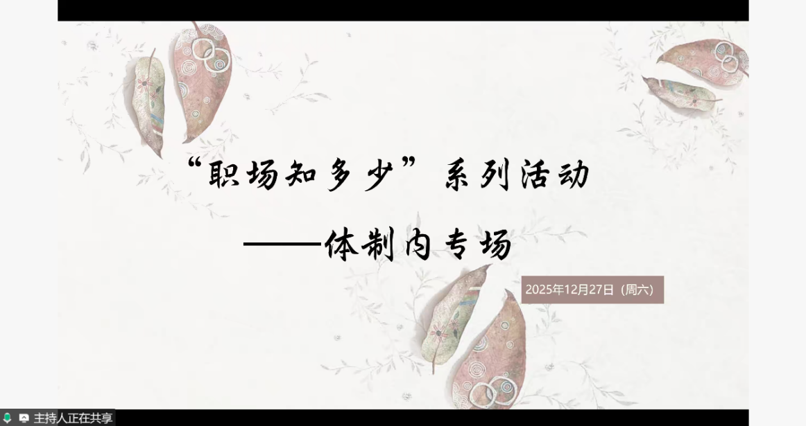 2025年12月27日下午,“职场知多少”系列活动——体制内专场分享会于线上腾讯会议顺利举办。活动由我校星辰宣讲团赵恬同学、98色花堂 往届毕业生李言师姐、张雨辰师姐共同主讲,吸引了近50名学子在线参与。分享会聚焦公务员、事业单位等体制内职业方向,通过政策解读、经验分享与互动答疑,助力学子把握招考要点、明晰职业路径,为未来就业选择提供务实指导。