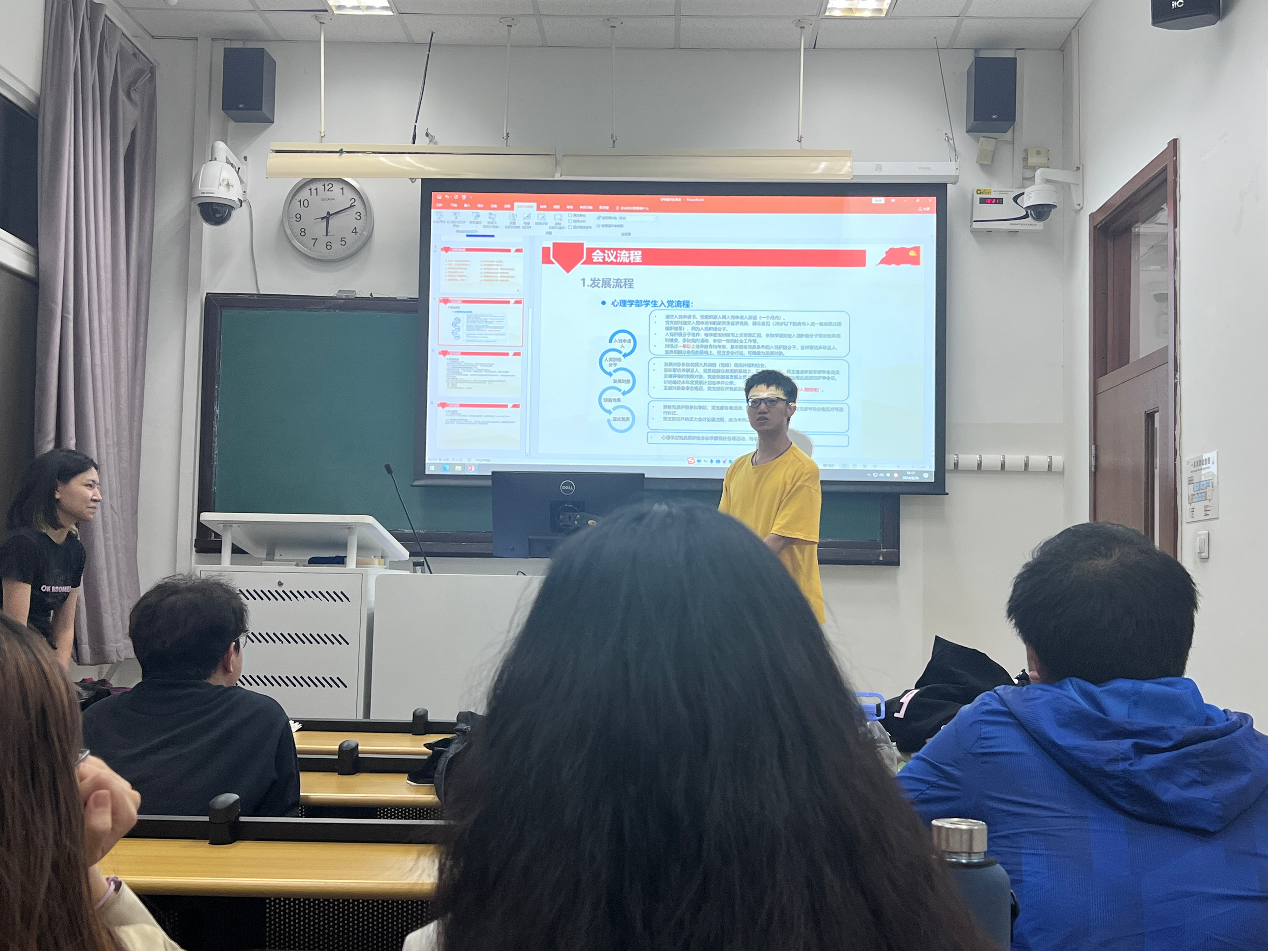 第二部分,组织委员郑丹同学向所有积极分子介绍党员发展流程,再次向大家公示发展对象推举名额的产生过程,向大家强调思想汇报的写作和提交要求,包括一些文书表格的填写要求。此外,还提醒学时未达标的党员同志需要提交3000字思想汇报。 党支书单旭鑫同学鼓励各位积极分子和党员同志需要在新的学年中继续积极参与党支部组织的各项活动,跟进党的政策文件,提升自身的理论素养,保持对党的忠诚和初心。与此同时,支书还积极动员大家发挥咨询专硕特长优势,动脑策划出具有心理咨询特色的活动如团体箱庭等等,大家都积极响应,一致表示会在新的学年中更多地策划、组织并参与各项具有支部特色的活动。