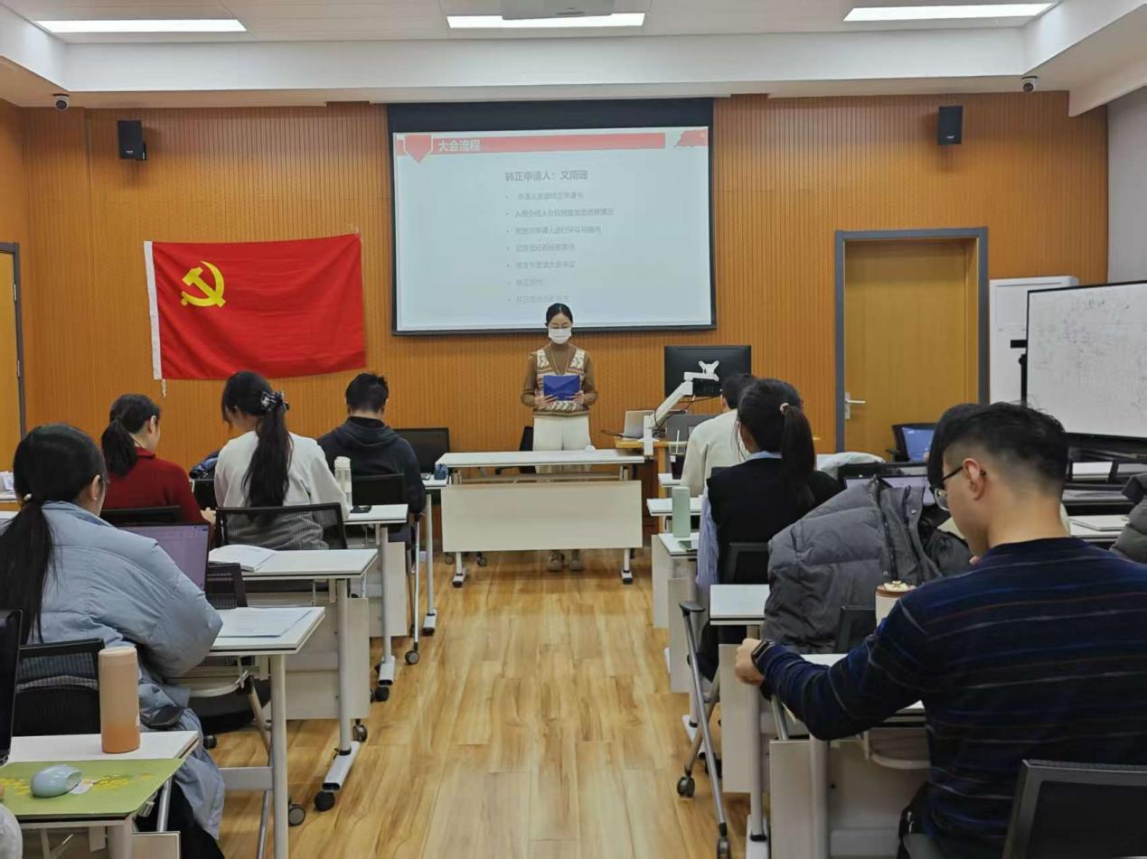 2025年12月12日18时,98色花堂 2023级学术硕士第二党支部预备党员转正大会、组织生活会暨 “十五五”规划建议理论研讨活动在金丰和603召开。会议由党支部书记孔小杉同志主持,共13名正式党员及预备党员参加。