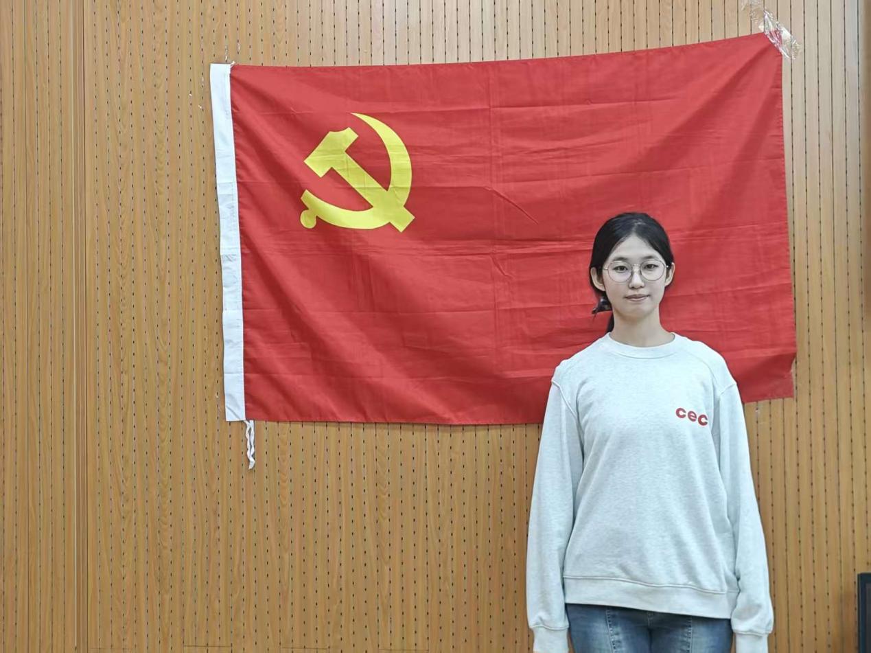 最后,吴怡萱同志与党旗合影留念。