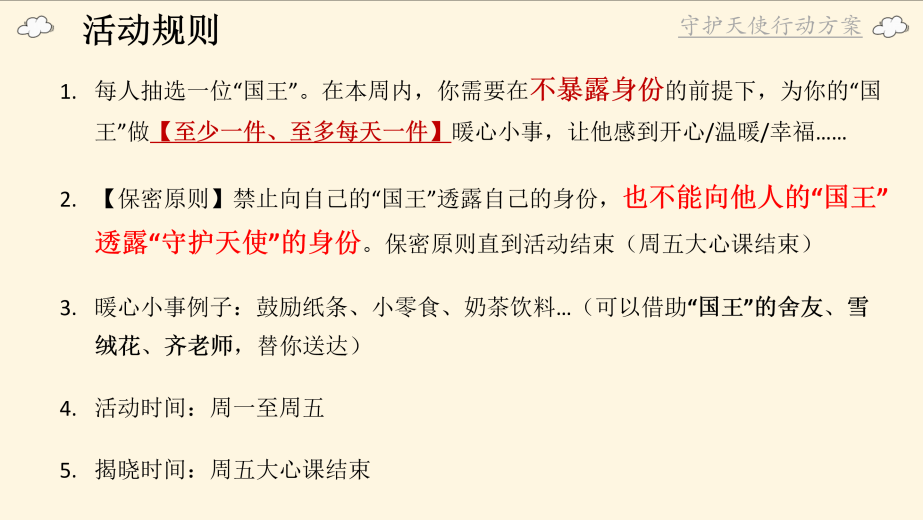 4月13日中午,班主任齐惠紫老师主持召开活动启动会,介绍了“守护天使”活动的具体规则。活动中,每位同学通过抽签方式确定自己需要守护的一位“国王”,在为期五天的活动期间,需要在不暴露身份的前提下,为“国王”做暖心小事(至少一次,至多每天一次),让ta感到开心、温暖、或幸福。齐老师着重强调了活动的保密原则,明确要求全体参与同学不得向自身守护的“国王”透露自己的身份,也不得泄露其他“国王”对应的“守护天使”的信息,确保活动的神秘感与趣味性。接着,同学们有序完成了抽签环节,正式开始了为期五天的守护行动。