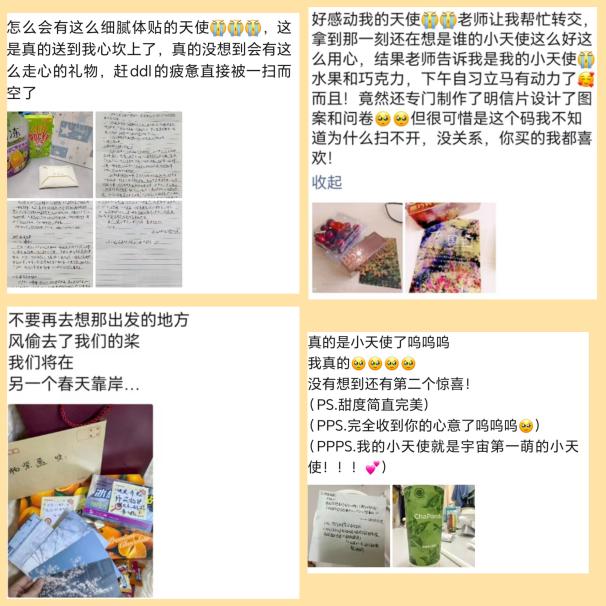 活动期间,全体“守护天使”积极响应活动号召,纷纷开始了自己秘密的守护行动。从一杯暖暖的奶茶、几颗甜甜的糖果,到一张精心设计的明信片、一段真挚恳切的文字;从结合“国王”喜好准备的专属小礼物,到在同学困境低谷时送上的意外惊喜;从每时每刻的积极关注,到生日夜的一缕烛光……“守护天使”们以多样的形式,给了自己的“国王”们最诚挚的关爱。