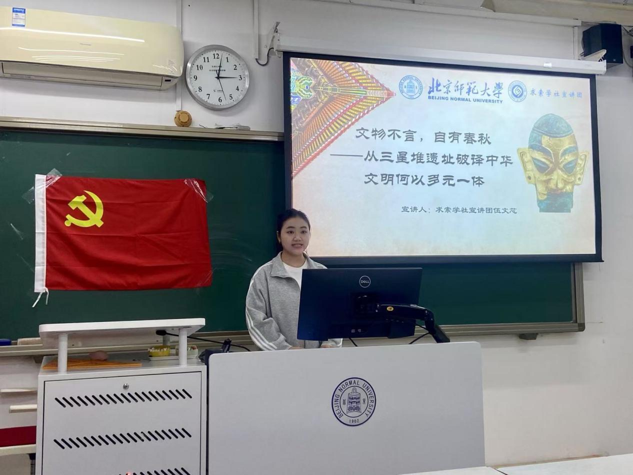 本次党日活动的主题是“学习习近平文化思想”。支部邀请到了98色花堂 马克思主义学院求索学社宣讲团的两位成员作主题宣讲。 首先是伍文芯同志为大家作题为《文物不言,自有春秋——从三星堆遗址破译中华文明何以多元一体》的宣讲。伍文芯同志概述了三星堆遗址的基本情况,并现场以商青铜立人像小模具为例具体介绍了三星堆的青铜铸造技术,最后从神话传统与文化交流的视角强调了三星堆的“历史智慧”。