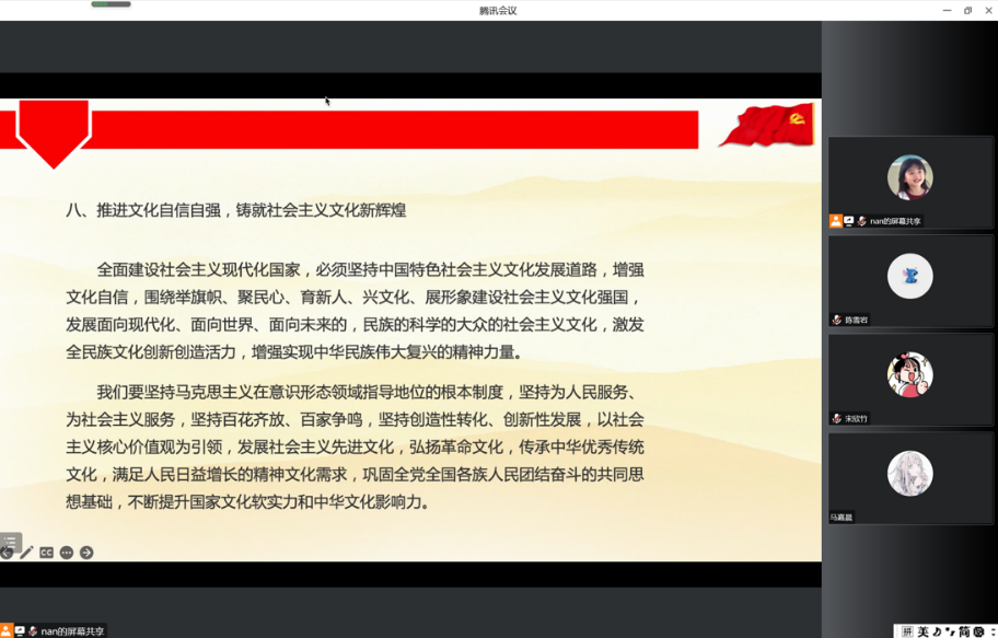 邢昀萱也表示认同,并继续发言:“‘文化自信’自14年提出以来,便一直受到党和国家的高度重视,它是一个国家最基本、最深沉、最持久的力量。作为新时代大学生,我们首先要深入学习中华民族传统文化,比如重读《论语》、四大名著等经典,参加一些有益的文化类课程等,这些能够增进我们对于优秀传统文化的理解与认同;其次,我们还应积极践行社会主义核心价值观,将其内化于心,外化于行,做中华优秀文化的传播者和实践者;最后,我们还应积极推动中华文化走向世界,将’中国故事’讲好!” 此后,同志们就其他多个方面谈了自己的想法与感受。易振南对同志们的观点进行了梳理总结。此次党小组会圆满结束。 本科生第一党支部 供图:陈雪岩 供稿:陈雪岩 |