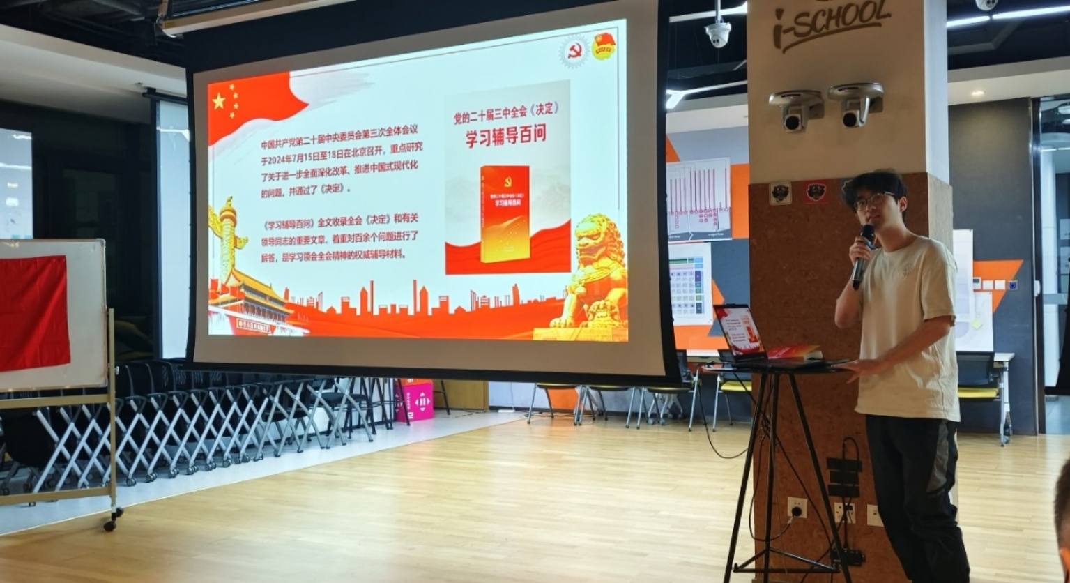 活动开始,奏唱国际歌。随后,陈正同学为大家带来了《青年话题面对面:党的二十届三中全会〈决定〉里的改革微观察》宣讲,陈正同学从党的各类会议名称讲起,向同学们解释了历届三中全会的重要地位,向各位同学介绍了《中共中央关于进一步全面深化改革、推进中国式现代化的决定》的主要内容,并从同学们关心的问题出发,针对全会中提出的教育和就业问题的政策做了详细介绍。